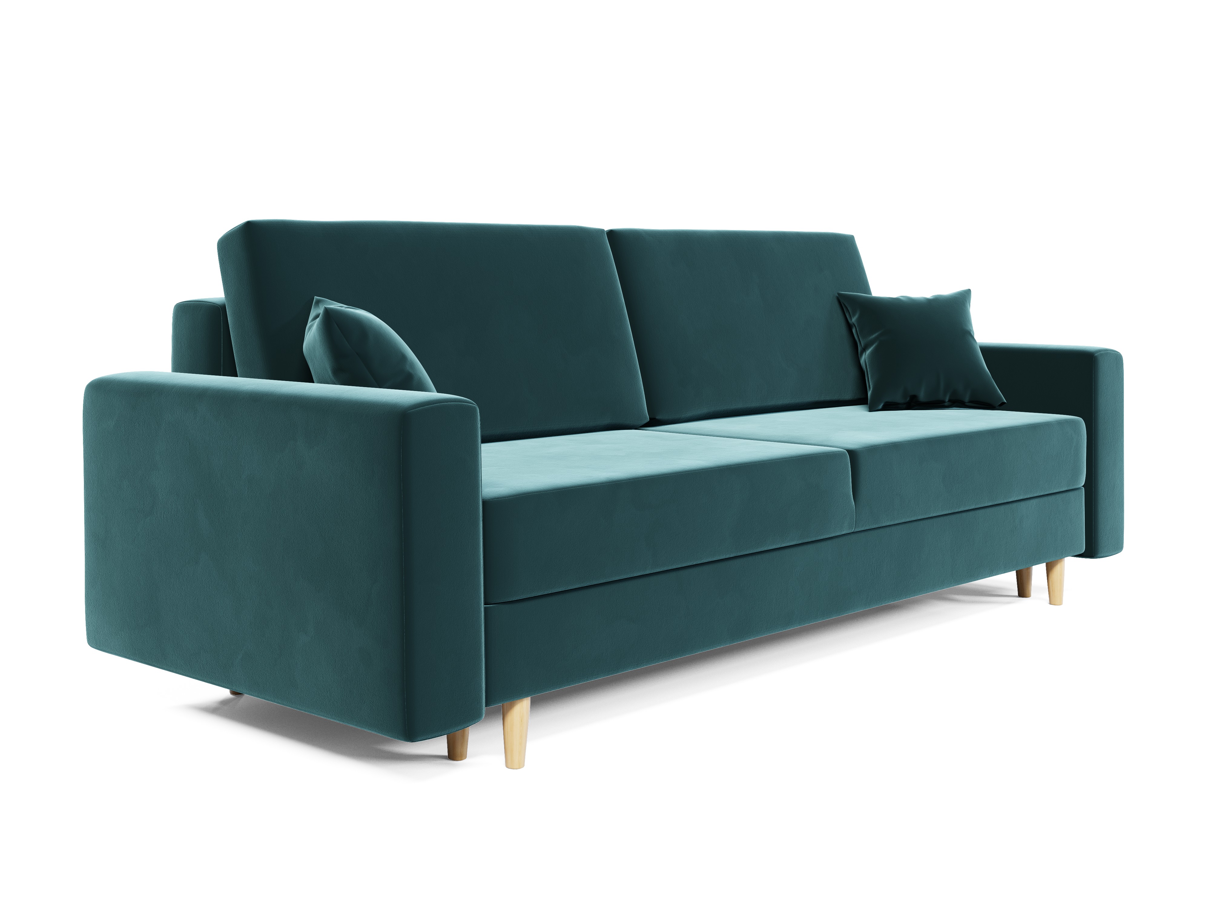 Táto celočalúnená pohovka s dvoma veľkými opierkovými a dvoma menšími vankúšmi na zips sa skvele hodí do moderných, škandinávskych aj minimalistických interiérov. Morská farba vniesie do priestoru sviežosť a zároveň vytvorí príjemnú atmosféru. Pre dokonalé doladenie priestoru môžete zvoliť aj minimalistický TV stolík, ktorý podčiarkne čistý a moderný štýl obývačky.