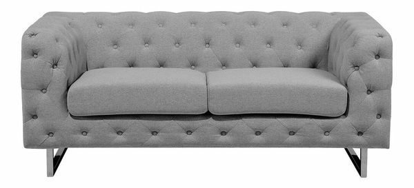 Vylepšite svoj obývací priestor a dodajte mu pôvab s touto dvojmiestnou čalúnenou pohovkou. Jej elegantný dizajn, ktorý je inšpirovaný štýlom Chesterfield v kombinácii so štýlom tuxedo, sa hodí do každého moderného, ale aj tradične zariadeného interiéru. Pohovka s kvalitným sivým čalúnením má nohy z nehrdzavejúcej ocele, hrubé sedacie vankúše pre lepší komfort a výrazné prešívanie s gombíkmi.