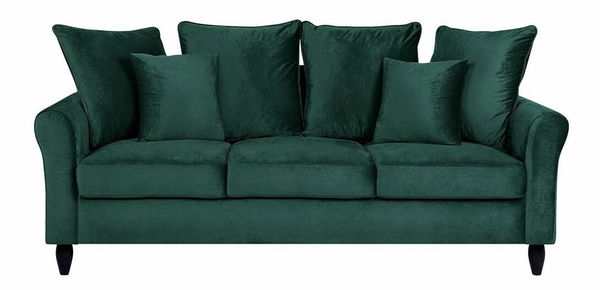 Táto pohovka je skutočne originálnym kúskom do každého moderného a elegantného interiéru. Trojmiestna pohovka s vankúšmi vystuženými ľahkou a nadýchanou penovou výplňou je čalúnená smaragdovozeleným polyesterovým zamatom, ktorý je príjemný na dotyk. Operadlo sa skladá zo šiestich vankúšov, ktoré pohovke dodávajú nádych retro štýlu. Spolu so zaoblenými ramenami a čiernymi nohami z eukalyptového dreva sa stane príjemným miestom na stretnutia s priateľmi.