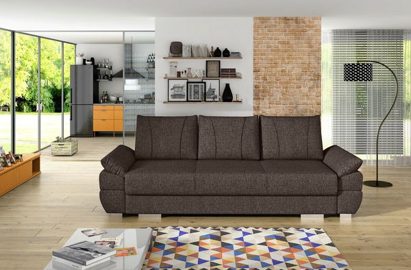 Elegantná pohovka trojsedačka Benny v tmavohnedej farbe je dokonalým doplnkom pre váš interiér, či už ide o obývačku, pracovňu alebo recepciu. Ponúka úložný priestor a možnosť rozložiť ju na príležitostné spanie. Vysoko kvalitná tkanina Inari 27, z ktorej je pohovka vyrobená, je veľmi odolná voči oderu a roztrhnutiu. Test oderuvzdornosti Martindale dosahuje hodnoty 49 000 cyklov. Konštrukcia pohovky Benny je z dreva a drevotriesky, pružina je falistá a výplň tvorí pena T-30. Nožičky sú plastové a majú chrómovú farbu. Pohovka má automatický rozkladací mechanizmus a plochu na spanie 197 x 147 cm. Hĺbka sedu je 56 cm, výška sedu 44 cm a výška nožičiek je 9 cm. Pohovka trojsedačka Benny je dodávaná v dvoch balíkoch s rozmermi 202x79x67 cm/70 cm a 97x60x50 cm/50 cm.