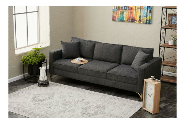Trojmiestna pohovka Berlunetta v antracitovej farbe so zlatými kovovými nohami je ideálnym doplnkom do moderných aj klasických obývacích izieb. Jej pevný bukový rám zaručuje dlhú životnosť a stabilitu, zatiaľ čo kvalitná 100% polyesterová tkanina je odolná a zároveň ľahko udržiavateľná, čo ocení každý, kto hľadá praktický a zároveň štýlový kus nábytku. Ak hľadáte aj ďalšie možnosti pohodlného sedenia, môžete zvážiť rozkladacie sedačky vhodné na každodenné spanie, ktoré ponúkajú flexibilitu a komfort.