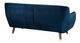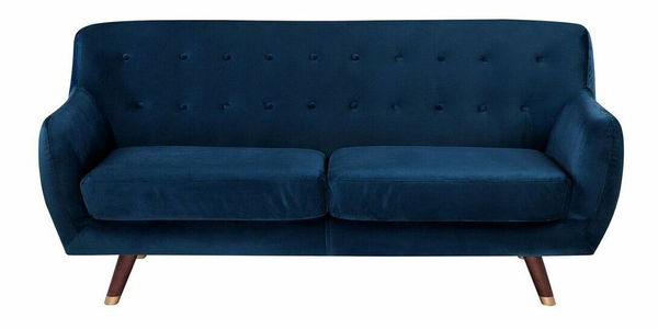 Táto trojmiestna pohovka s nádherne tvarovaným dizajnom sa postará o maximálne pohodlie. Operadlo s prešívaním, bočné opierky a šikmé nohy z kaučukového dreva sú inšpirované retro štýlom. Pohovka je čalúnená odolným polyesterovým zamatom v tmavom odtieni modrej farby. Sedacie vankúše majú snímateľné poťahy, vďaka ktorým je ich čistenie jednoduchšie.