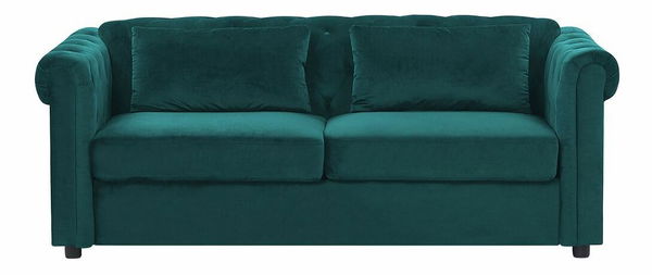 Táto pohovka je kombináciou populárneho dizajnu Chesterfield, trendového štýlu glamour a funkčnosti a vašej obývacej izbe dodá výrazný charakter. Vďaka vystuženej konštrukcii a hlbokej sedacej ploche je priam stvorená na oddych. Šikovne ukrytý výsuvný mechanizmus umožňuje rozloženie pohovky na posteľ pre jednu osobu, ktorá poslúži ako posteľ pre hostí. Prešívanie s gombíkmi či zahnuté bočné opierky sú pre štýl Chesterfield charakteristické a sú doplnené zamatovým čalúnením, ktoré dotvára dizajn pohovky, ktorá je synonymom moderného luxusu. Pohovka má jednoduché nohy v čiernej farbe, ktoré sú minimalistickým detailom zjemňujúcim celkový vzhľad tohto kusu nábytku.