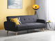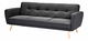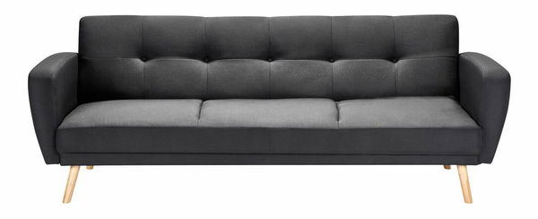 Moderná čierna pohovka navrhnutá v retro štýle je skvelým riešením do menších priestorov. Široké a hrubé čalúnené sedadlo ponúka pohodlné sedenie pre tri osoby a vďaka rozkladaciemu mechanizmu sa dá jednoducho zmeniť na dvojlôžkovú posteľ. Pohovka má odolné látkové čalúnenie so štýlovým prešívaním a zošikmené drevené nohy.