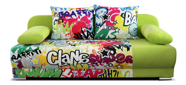 Moderná sedačka, 3-sed, je vhodná do menšej obývacej, detskej či študentskej izby. Čalúnenie je z kombinácie mikrofázy a bavlny s grafitovým vzorom. Obsahuje vankúšiky na opretie rúk aj chrbta. Nohy sú kovové a dokonale dopĺňajú dizajn sedačky. Systém automat zaručuje rýchle a jednoduché rozloženie. Pohodlne sa na nej vyspia aj dve osoby. Na umiestnenie vankúšov a posteľného prádla slúži úložný priestor.