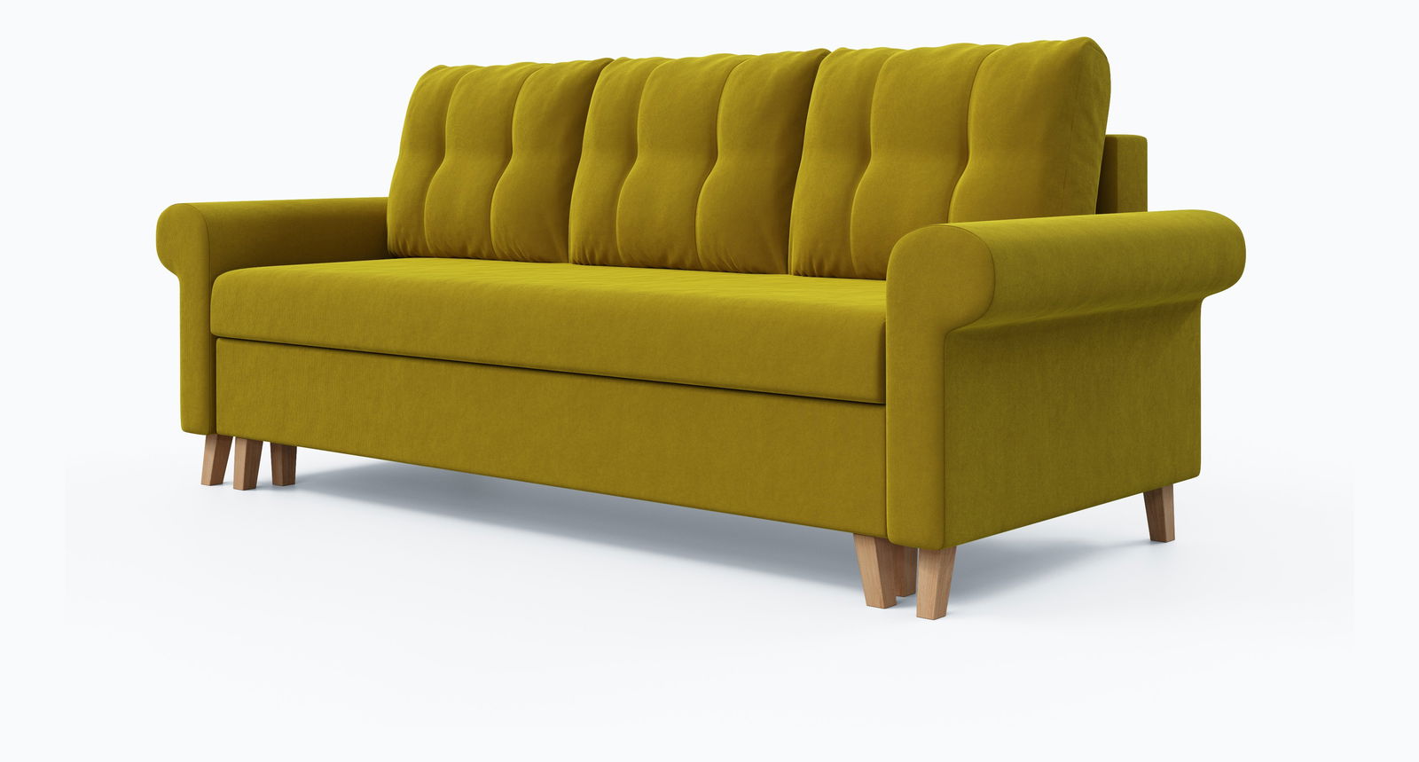 Pohovka trojsedačka Ostrol v žltej farbe je vysoká 93 cm a má hĺbku 90 cm. Tento kus nábytku je veľmi pohodlný a štýlový, vďaka čomu sa hodí na umiestnenie v každej domácnosti. Sedačka má pekne vypracovaný chrbát, čo umožňuje jej umiestnenie kdekoľvek. Navyše, jednoducho sa rozkladá a tvorí tak priestor na spanie. K sedačke sú tiež priložené tri veľké opierkové vankúše so zipsom, čo uľahčuje ich čistenie. Sedačka obsahuje polyuretánovú penu a Bonnellové pružiny a jej rozmery na spanie sú 194 x 130 cm. Nožičky sú vyrobené z bukového dreva (11 cm) a vnútorný rám je z dreva a drevotriesky. Celý produkt je balený do troch balíkov, ktoré majú rozmery 205x75x60 cm/80 kg, 90x60x35 cm/15 kg a 70x50x20 cm/5 kg.