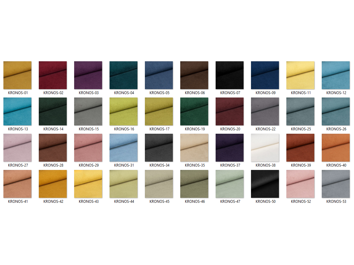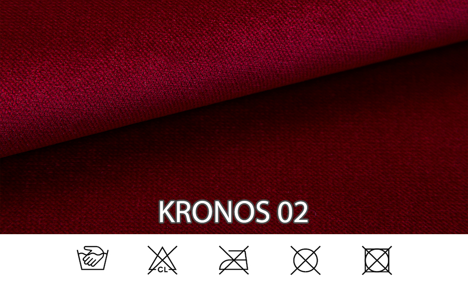 Kronos je plyšová textília, pekná a jemná na dotyk. Je trváca a je oteruu vzdorná počas používania. Táto látka sa vyznačuje vysokou odolnosťou voči svetlu. Ideálne sa hodí na čalúnenie kresiel, pohoviek, sedacích súprav a dekoratívnych vankúšov. Nesmie sa prať na mokro, bieliť a nesmie sa vystavovať vysokým teplotám. Gramáž: 275 g/m². Zloženie:100% PES.