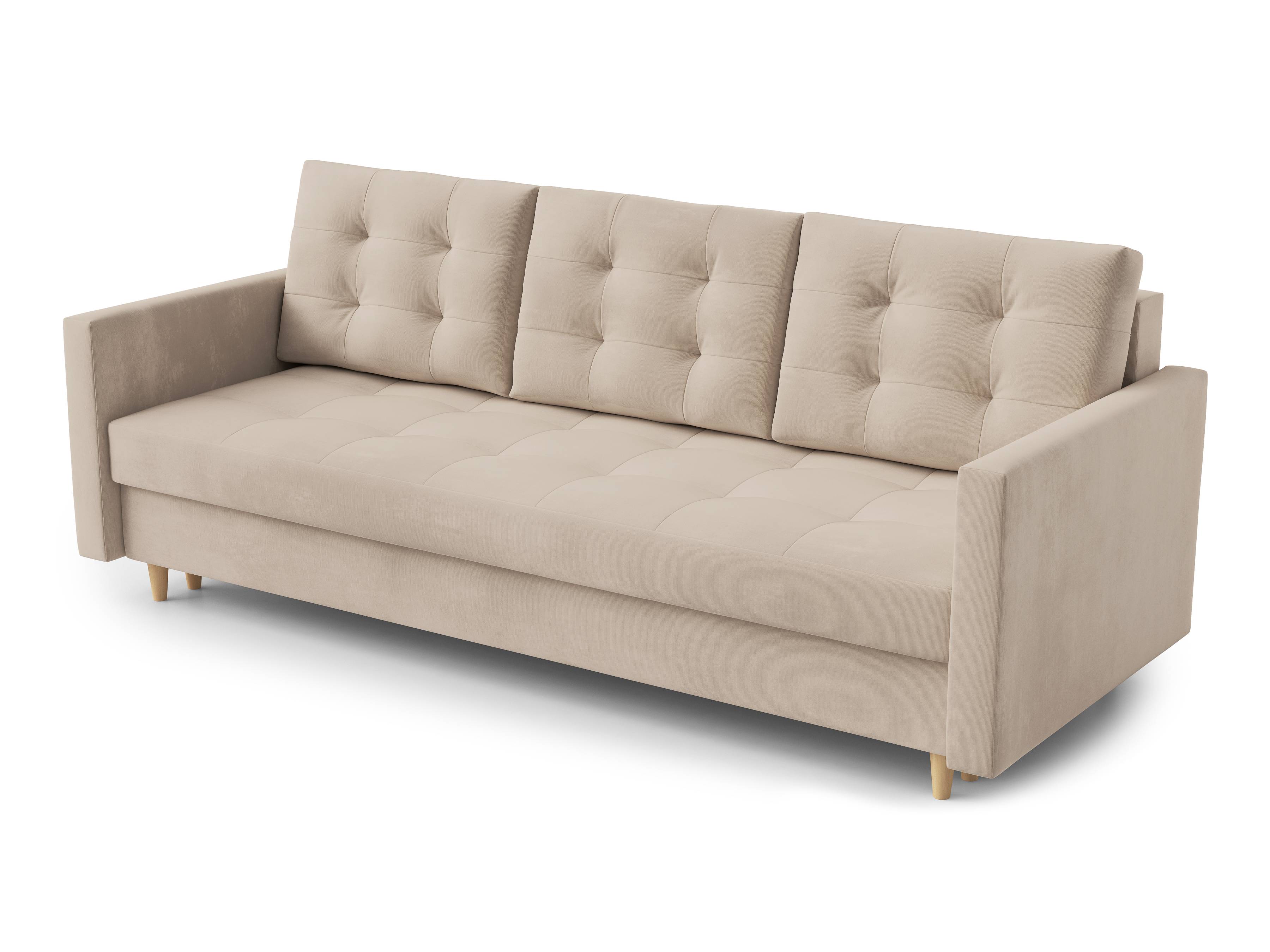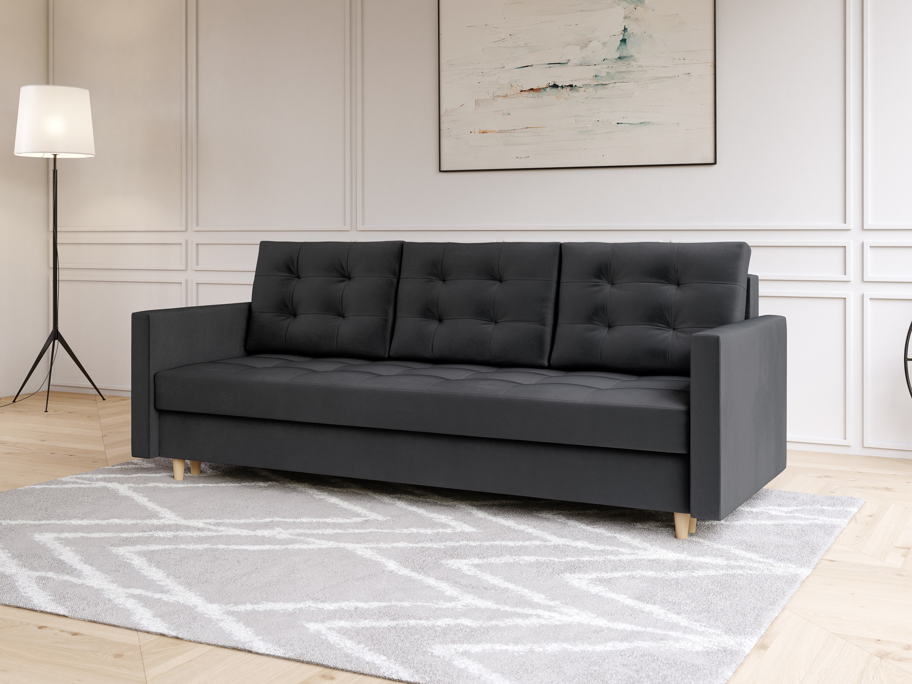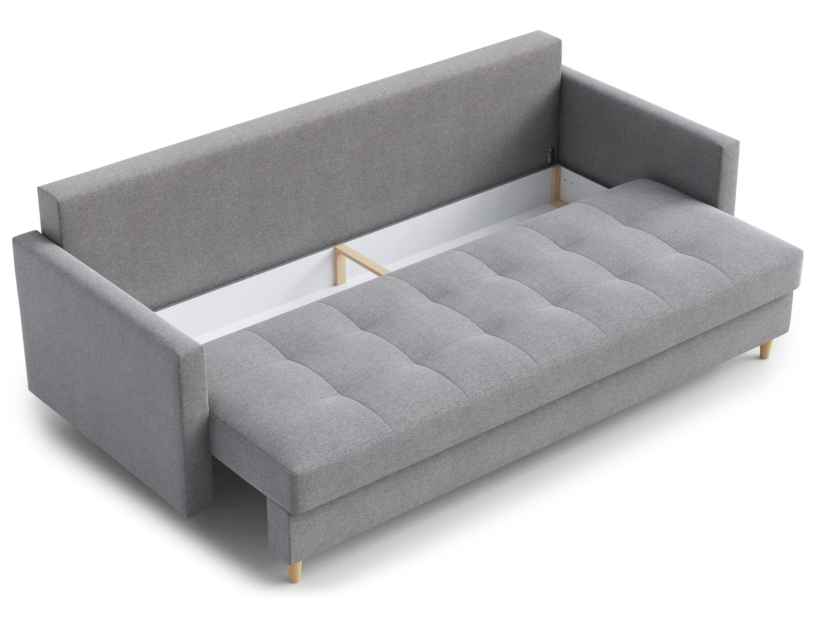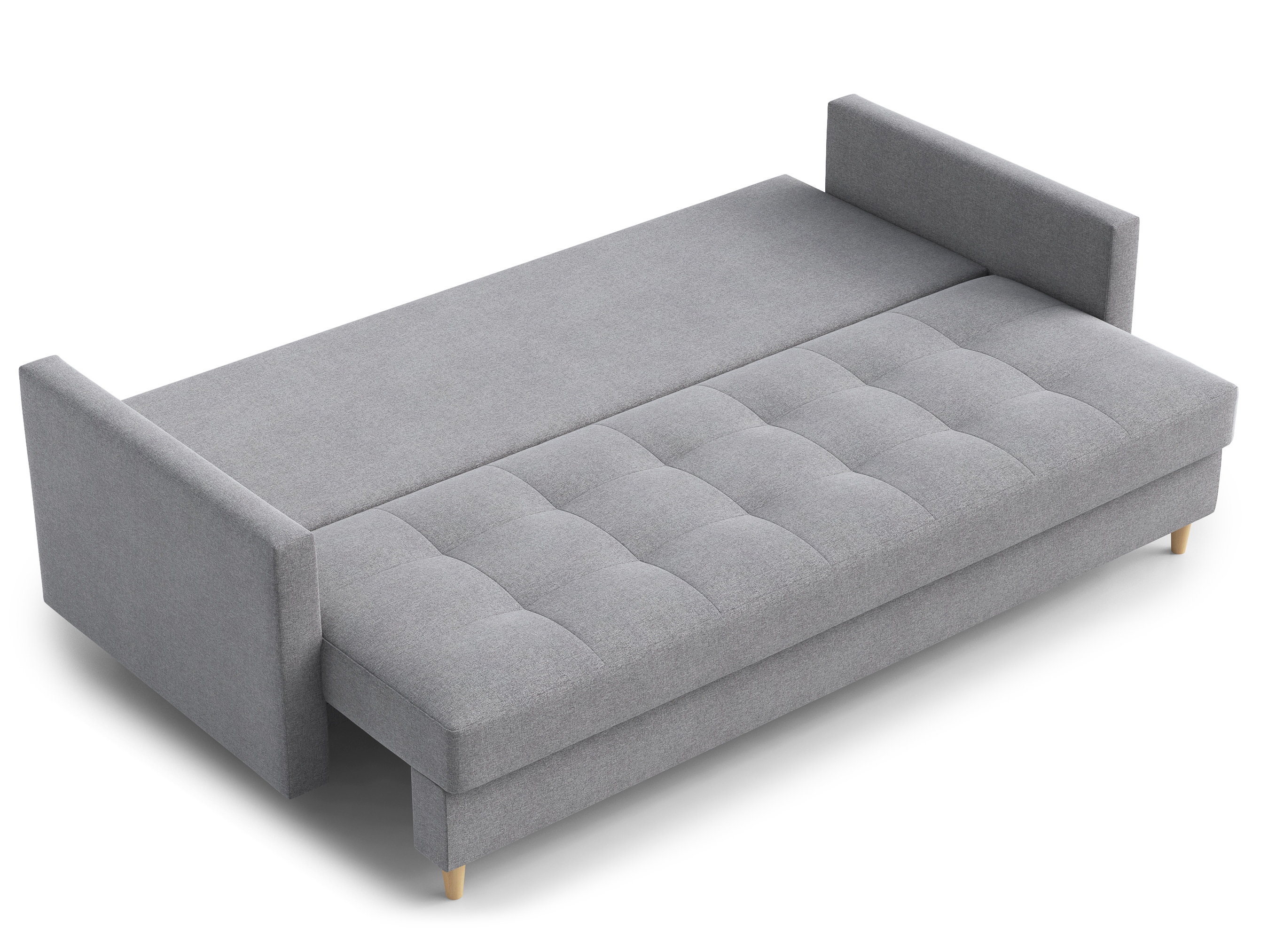 Pohodlná a elegantná trojsedačka, ktorá ponúka štýl a funkčnosť pre každú obývaciu izbu. Postavená na pevnej konštrukcii z dreva a 18 mm nábytkovej dosky, s materiálom nožičiek tiež z dreva a v naturálnej farbe. Tento nábytok je navrhnutý tak, aby poskytoval komfort vďaka výplni sedadla a operadla z bonellových pružín a peny T 30. Prešívané dizajnové prvky na sedadle a operadle pridávajú elegantný dotyk. Nožičky sú vyhotovené v naturálnej farbe a majú výšku 10 cm. S rozmernou plochou na spanie 200x140 cm, úložným priestorom v bielej farbe a tromi pohodlnými poduškami, táto súčasne štýlová a praktická trojsedačka je ideálnou voľbou pre každý domov. Čalúnená zadná strana umožňuje flexibilitu umiestnenia kdekoľvek v miestnosti.
