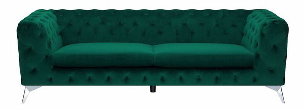 Ladná silueta tejto trojmiestnej pohovky s nízkym operadlom vnesie do vášho interiéru pohodlie a nadčasovú eleganciu a stane sa stredobodom miestnosti. Smaragdovozelené zamatové čalúnenie vyzerá naozaj výnimočne a je príjemné na dotyk. Vďaka klasickému prešívaniu s gombíkmi a štýlovým kovovým nohám bude vyzerať dokonale v moderných interiéroch zariadených v minimalistickom, retro či glamour štýle.