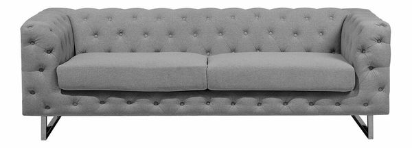 Vylepšite svoj obývací priestor a dodajte mu pôvab s touto trojmiestnou čalúnenou pohovkou. Jej elegantný dizajn, ktorý je inšpirovaný štýlom Chesterfield v kombinácii so štýlom tuxedo, sa hodí do každého moderného, ale aj tradične zariadeného interiéru. Pohovka s kvalitným sivým čalúnením má nohy z nehrdzavejúcej ocele, hrubé sedacie vankúše pre lepší komfort a výrazné prešívanie s gombíkmi.