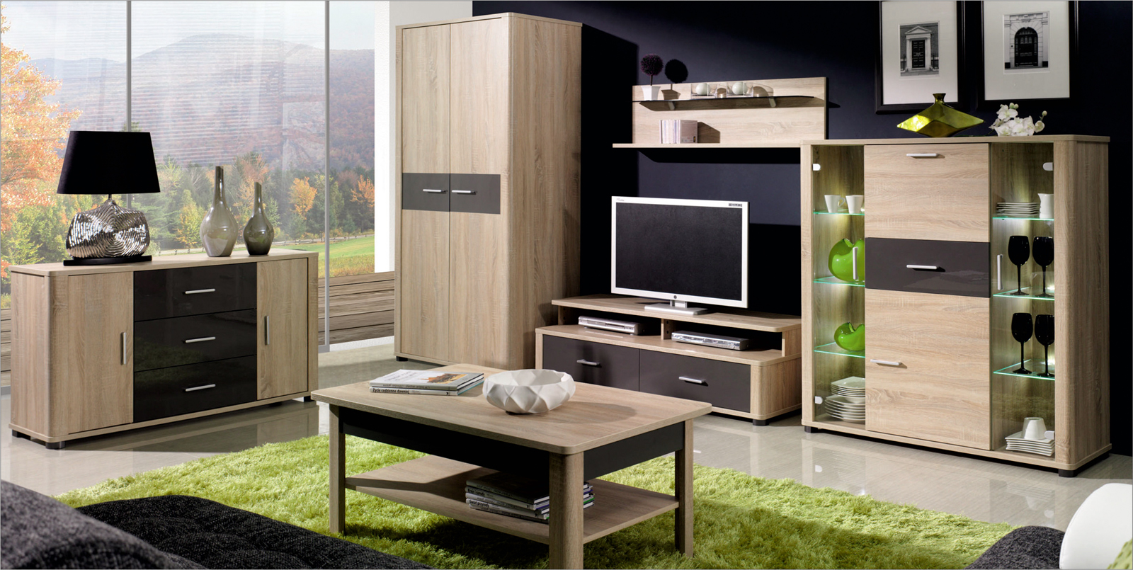 Moderná klasika, ktorá sa bude skvele vynímať vo Vašej obývacej izbe. Sektor je zložený zo siedmich prvkov, ktoré bohate stačia na zariadenie celého priestoru. Farebné prevedenie populárneho dubu Sonoma je doplnené o elegantné prvky vo farbe lesk grafit. Spolu s vhodným kobercom a sedačkou, ktoré si môžete vybrať a priobjednať z našej ponuky, budete mať moderný a nadčasový priestor.