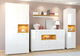 Nábytok je nevšedný kombináciou jemnej bielej farby, na dvierkach v lesku, a vnútrom vo farbe dreva dub svetlý, ktorý dokonale imituje prírodné drevo. Elegantné kovové úchyty dopĺňajú celkový dizajn modelovej rady. Voliteľné biele osvetlenie navodí ukľudňujúcu atmosféru v priestore. Dosky sú z lamina najvyššej kvality. Je odolné voči poškriabaniu, vlhkosti a vysokým teplotám. To Vám zaručí, že aj po čase bude vyzerať Váš nábytok stále ako nový. Zásuvky a dvierka obsahujú dorazový systém.