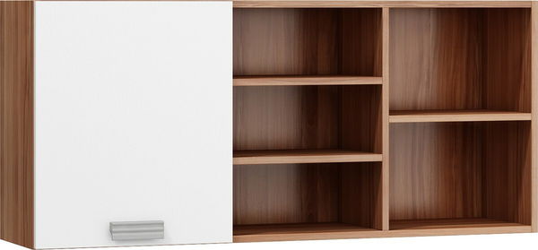 Trojdielna polička na stenu so skrinkou umiestnenou na ľavej strane. V strede a na ľavej strane sa nachádzajú poličky. Dvierka skrinky sú v prevedení lesklej bielej farby a korpus je v prevedení slivka.