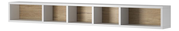 Jednoduchá polička v bielej farbe pôsobí moderne a elegantne hlavne ako doplnok nábytku z modelovej rady Terence. Polica je rozdelená na 5 častí a využiť sa dá aj priestor na hornej doske. Vďaka univerzálnej bielej farbe s kombináciou farby dub sa dá ale jednoducho skombinovať s akýmkoľvek nábytkom. Polička je ideálna do obývačky alebo aj pracovne.