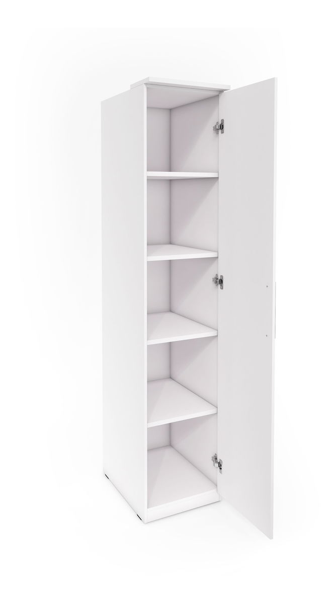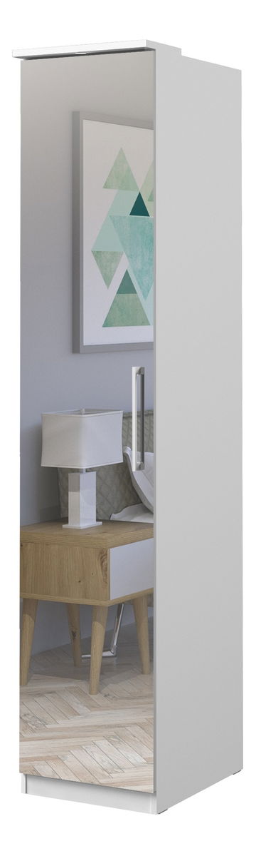 Skriňa Centaury Typ 57 (biela + biely lesk) s výškou 217 cm a hĺbkou 63 cm je dokonalým riešením pre tých, ktorí hľadajú útulné úložné riešenie pre svoje veci. S bielym matným korpusom a blyštiacim sa bieľom lesklého predného panela, táto uzka šatníková skrinka disponuje štyrmi policami za dverami a zrkadlom, ktoré vizuálne zväčšuje miestnosť. Skriňa Centaury Typ 57 patrí do modelového radu Centaury, ktorý pripomína elegantný, moderný a minimalistický štýl škandinávskeho dizajnu. Skladaním si šatníkovú skriňu môžete prispôsobiť vašim predstavám a potrebám, a využiť tak jej rozmanitý úložný priestor. Vyrobená je z kvalitnej laminovanej drevotriesky a má kovové úchytky. Ak si želáte, môžete dokúpiť aj LED osvetlenie.