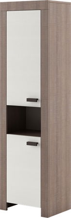Vysoká úzka policová skriňa, s dvierkami hore a dole a jednou otvorenou poličkou v strede.