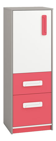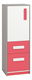 Úzka policová skriňa má v hornej časti štyri police a v dolnej jednu veľkú a jednu malú zásuvku.