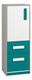 Úzka policová skriňa má v hornej časti štyri police a v dolnej jednu veľkú a jednu malú zásuvku.