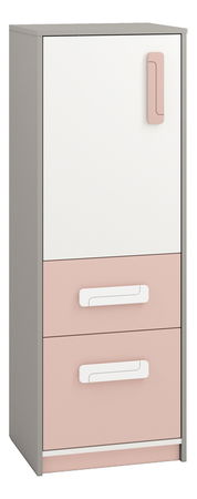Úzka policová skriňa má v hornej časti štyri police a v dolnej jednu veľkú a jednu malú zásuvku.
