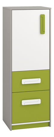 Úzka policová skriňa má v hornej časti štyri police a v dolnej jednu veľkú a jednu malú zásuvku.