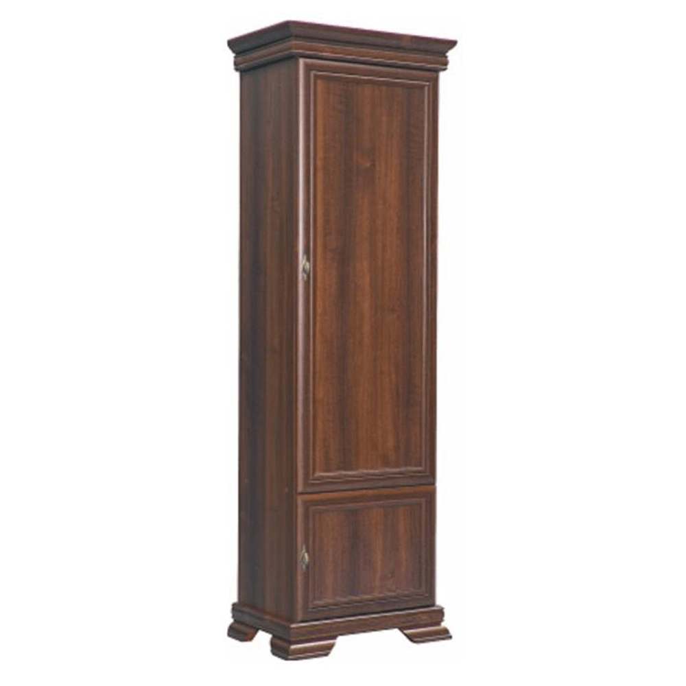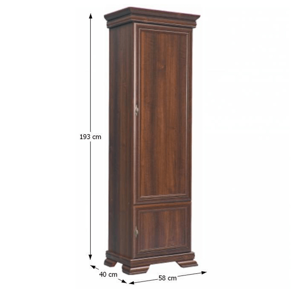 Policová skriňa Kraz KRD1 s výškou 193 cm a hĺbkou 40 cm je ideálnym doplnkom pre každú obývačku, pracovňu alebo jedáleň. Táto vysoká jednodverová skriňa má malé dvierka v spodnej časti a masívny vzhľad, ktorý dotvárajú vyrezávané nožičky, lišty a kovové úchyty na dvierkach. Skriňa je vyrobená z laminovanej DTD, MDF a kovu a jej farebné prevedenie v Samoa king farbe dodáva vašim priestorom elegantný a rustikálny vzhľad. Nábytok Kraz je ideálnou voľbou pre tých, ktorí preferujú tradičný vzhľad nábytku a radi by si zariadili svoju domácnosť v rustikálnom štýle. Skriňa má hrúbku materiálu korpusu 15 mm, vrchnej a dolnej dosky 22 mm a výšku spodného priestoru od podlahy 10,5 cm. Zariadite si svoje interiéry pomocou nábytku Kraz a jeho širokej ponuky skríň, skriniek, stolíkov a ďalších prvkov.
