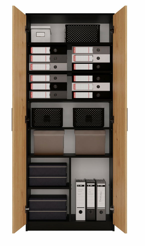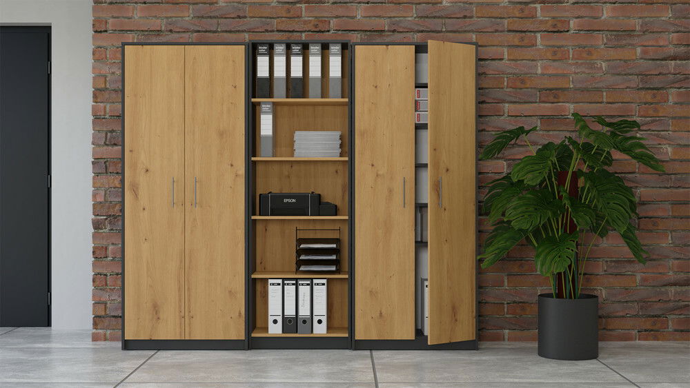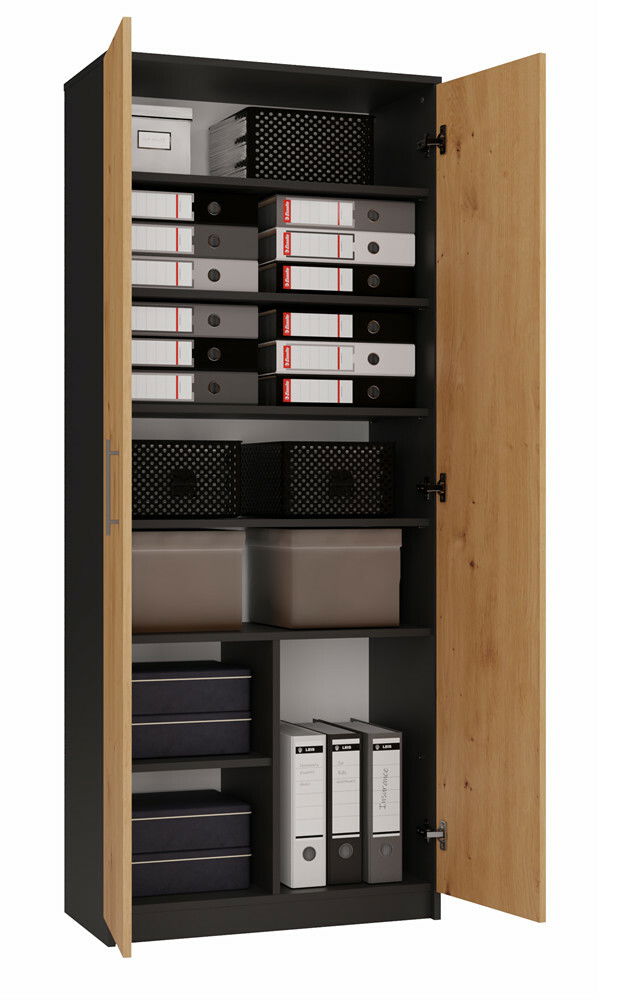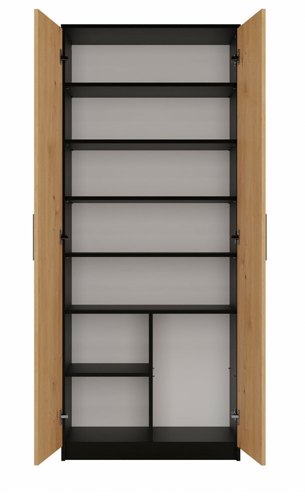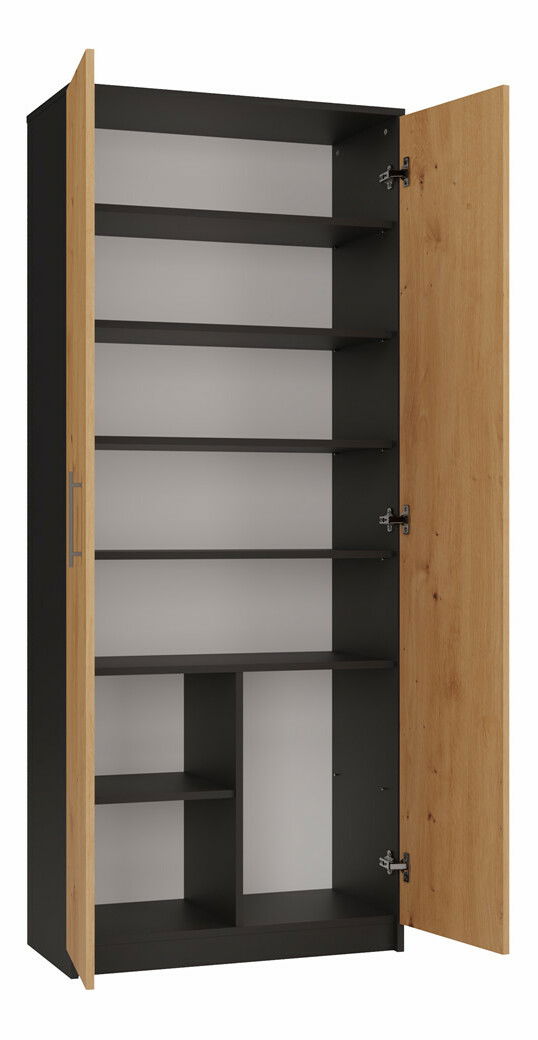 Policová skriňa Obtenidas 1 v elegantnej kombinácii antracit a dub artisan je ideálnym riešením pre moderné interiéry. S ôsmimi praktickými poličkami a dvoma dverami ponúka dostatok priestoru na uskladnenie dokumentov, kníh či iných predmetov, pričom minimalistická konštrukcia a kvalitná laminovaná doska s hrúbkou 16 mm zabezpečujú jej odolnosť voči poškriabaniu a vlhkosti. Estetické prevedenie bez viditeľných otvorov na vonkajších stranách zvyšuje jej atraktivitu, čím sa stáva skvelým doplnkom do obývačky, detskej izby či kancelárie.
