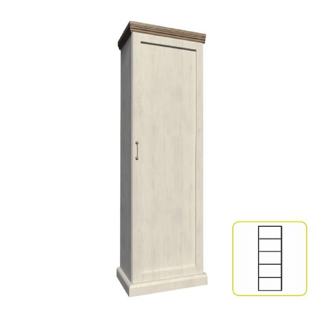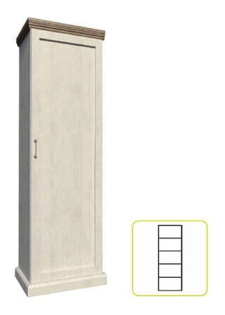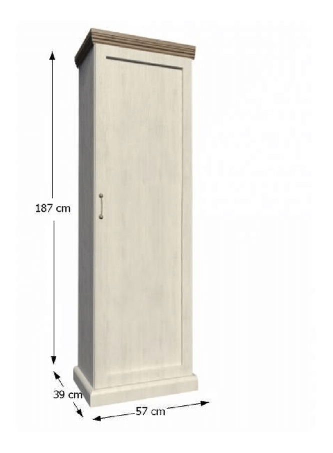 Policová skriňa Regnar S1D vysoká 187 cm hlboká 39 cm sosna nordická + dub divoký je elegentná jednodverová skriňa v anglickom štýle, ktorá zaujme svojím sviežim vzhľadom a vrchnou ozdobnou lištou. Je vhodná na zariadenie obývacích izieb, spální, pracovní alebo predsiení. Farebné prevedenie kombinuje bielu sosnu nordickú s dubom divokým. Sektorový nábytok Regnar je elegantný, masívnejší a kombinuje anglický štýl s ozdobnými lištami a kovovými úchytkami. Komponenty tejto modelovej rady presvetlia a skrášlia priestory vašich miestností. Skriňa je vyrobená z DTD laminovanej s ozdobnými lištami a kovovou úchytou. Korpus má hrúbku 15 mm, vrchná doska 22 mm. Skriňa sa dodáva v demonte.