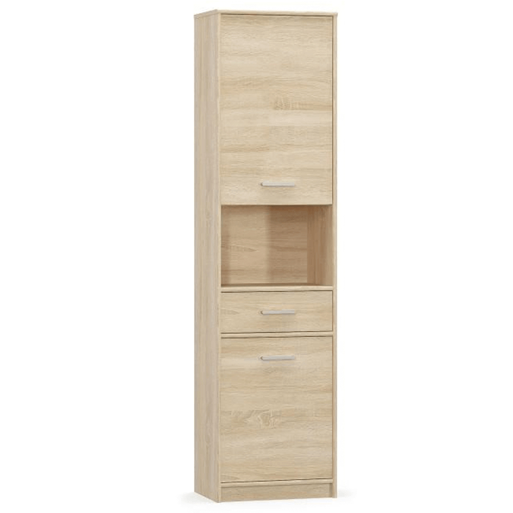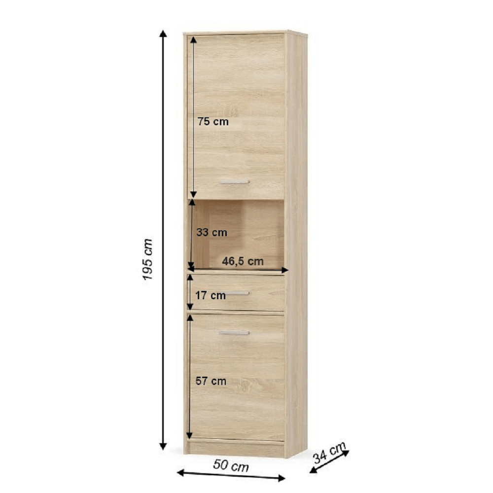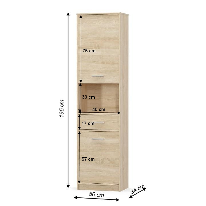 Policová skriňa Thornham 2D1S s výškou 195 cm a hĺbkou 34 cm v dub sonoma farebnej variante je moderné a funkčné riešenie pre detskú alebo študentskú izbu. Skriňa má dvoje dvierka, otvorenú poličku a zásuvku. Horná aj dolná skrinka majú poličky, na ktoré je možné umiestniť knihy a ďalšie veci. Materiál skrine je DTD laminovaná s hrúbkou 16 mm. Skriňa je vybavená univerzálnymi dvierkami, ktoré sú vhodné pre každé prostredie. Skriňa sa dodáva v demonte.