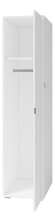 Jednodverová úzka šatníková skriňa vás prekvapí svojim šikovným využitím. Svojimi rozmermi sa zmestí do každého voľného priestoru, avšak ponúka veľkorysí úložný priestor pre vaše oblečenie. Skriňa má plné dvierka, 1 poličku a 1 závesnú tyč. Táto skriňa sa dá zakúpiť v pravom aj v ľavom prevedení dvierok, takže si môžete vybrať, ktorá vám viac vyhovuje. Skriňa stojí na nožičkách, takže má zabezpečené vetranie. Úchytky skrine sú menšie podlhovasté s úchytok zospodu.