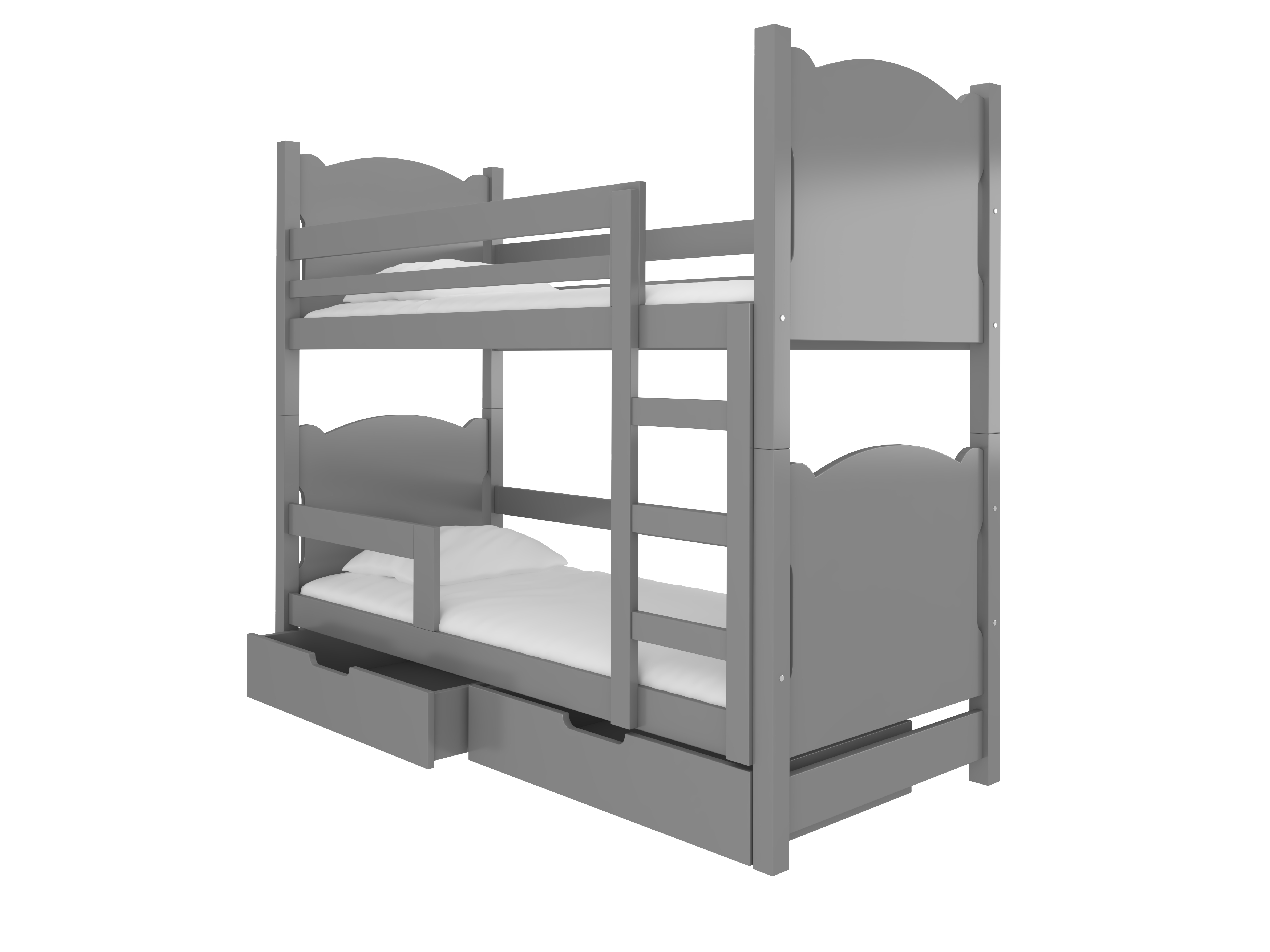 Poschodová detská posteľ 180x75 cm Marryann (s roštom a matracom) (sivá) výška 160 cm hĺbka 188 cm Sivá Popis: Detská posteľka MARRYANN je pre vaše deti unikátnym miestom, kde sa budú cítiť milované, bezpečné a šťastné. Táto posteľka má elegantné oblúkové hrany a čely v tvare uší, ktoré prinášajú do izby dotyk hravosti a nekonečného pôvabu. Posteľka Marryann je vyrobená z prírodného borovicového dreva, ktoré prináša do vašej domácnosti príjemnú atmosféru a teplý nádych prírody. Stred postele a čelá zásuviek sú vyrobené z MDF dosky, ktorá zabezpečuje pevnosť a trvanlivosť. Tento kombinovaný materiál dodáva posteľke štýlový vzhľad, ktorý si zaslúži obdiv. Vaše deti budú mať kvalitný spánok, pretože posteľka Marryann je vybavená roštom z pružných lamiel v systéme Flex. Tento rošt zaručuje optimálnu podporu a prispieva k zdravému spánku. Posteľka je tiež vybavená penovým matracom s odnímateľným poťahom na zips, čo zaisťuje jednoduchú údržbu a čistotu. Ak chcete udržať izbu upratanú a organizovanú, s posteľkou Marryann to nie je problém! Posteľka má dve vysúvacie zásuvky na gumených kolieskach, kde môžete uložiť hračky, knihy a iné potrebné veci. Vaše deti sa tak môžu sústrediť na hranie a objavovanie nových dobrodružstiev. Posteľka Marryann ponúka dve rozmerné plochy na spanie – 180 x 75 cm, čo poskytuje dostatok miesta pre dve osoby. Táto posteľka je miestom, kde sa vaše deti môžu spoločne rozprávať príbehy, zdieľať tajomstvá a budovať silné puto medzi sebou. S bariérou proti spadnutiu zaisťujete bezpečný a pokojný spánok vašich malých pokladov. Materiál: borovicové drevo, stred postele a čelá zásuviek sú z MDF dosky. Rošt: áno, vyrobený z pružných lamiel v systéme Flex. Matrac: áno. Typ matraca: penový s odnímateľným poťahom na zips. Úložný priestor: áno, 2x vysúvacie zásuvky na gumených kolieskach. Plocha na spanie: 2x 180 x 75 cm. Bariéra proti spadnutiu: áno. Poznámka: Vo výrobnom procese sa používajú ekologické vodové farby, ktoré sú bezpečné pre deti a odolné voči mechanickému poškodeniu. K baleniu prislúcha: príslušenstvo na montáž a montážny návod. Počet balíkov: 2. Balík 1: 81x22x82 cm. Balík 2: 180x18x75 cm. Váha balíkov: 64 kg.