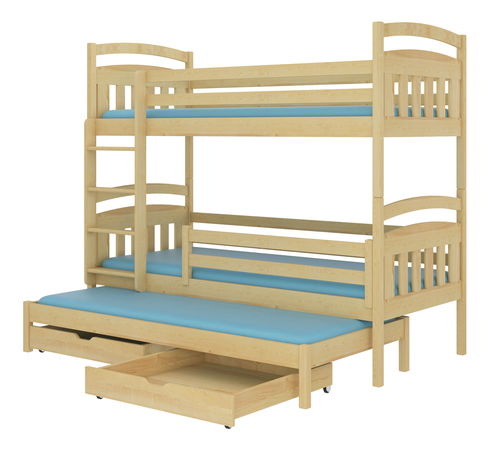 Poschodová detská posteľ ALADÁR s roštom a matracom je vyrobená z kvalitnej borovice a jej rozmery sú 180x80 cm. Výrobok s výškou 164 cm a hĺbkou 188 cm ponúka praktické využitie priestoru a má hrúbku nôh 40x40 mm a ostatných prvkov 20-22 mm. Lamelový rošt hrúbky 2 cm poskytuje optimálnu oporu a pohodlie. Posteľ je vybavená penovým matracom s odnímateľným poťahom na zips. Matrac na spodnom výsuvnom lôžku je o 10 cm kratší, aby sa lepšie prispôsobil veľkosti posteľe. Postieľka má dve vysúvacie zásuvky na gumených kolieskach na ukladanie hračiek a oblečenia a praktický úložný priestor. Posteľka ALADÁR má veľkorysú plochu na spanie a tretie výsuvné lôžko, ktoré je ideálne pre hostí alebo súrodencov. Bariéra proti spadnutiu na hornom lôžku zabezpečuje bezpečnosť a pokojný spánok. ALADÁR tiež ponúka možnosť výberu strany rebríka, čo umožňuje prispôsobiť postieľku podľa preferencií a priestoru v izbe. Produkt sa dodáva v balení, ktoré zahŕňa príslušenstvo na montáž a montážny návod a pozostáva z 4 balíkov, ktorých celková váha je 103 kg. Pri výrobe sa používajú ekologické vodové farby, ktoré sú bezpečné pre deti a odolné voči mechanickému poškodeniu.