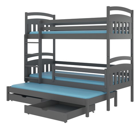 Poschodová detská posteľ 180x80 cm - Aladar (s roštom a matracom) (grafit) je praktické a štýlové riešenie pre detskú izbu. Je vyrobená z kvalitného borovicového dreva s hrúbkou noh 40x40 mm a ostatných prvkov 20-22 mm, zabezpečujúc tak jej pevnosť a odolnosť. Posteľ je vybavená lamelovým roštom s hrúbkou 2 cm a penovým matracom s odnímateľným poťahom na zips, zaručujúc optimálne pohodlie pri spaní. Spodné výsuvné lôžko má matrac o 10 cm kratší, aby sa ideálne prispôsobil veľkosti dieťaťa. Postieľka disponuje aj praktickým úložným priestorom s 2 vysúvacími zásuvkami na gumených kolieskach, čím udržia izbu organizovanú. Tretie lôžko je výsuvné, čo umožňuje ďalšie príjemné prekvapenie pre hostí alebo súrodencov. Bariéra proti spadnutiu na hornom lôžku zabezpečuje bezpečnosť a pokojný spánok. Aladar tiež ponúka možnosť výberu strany rebríka, čo umožňuje prispôsobiť postieľku podľa preferencií a priestoru v izbe. Postieľka sa dodáva v 4 balíkoch s príslušenstvom na montáž a jednoduchým návodom. Vo výrobnom procese sa používajú ekologické vodové farby, ktoré sú bezpečné pre deti a odolné voči mechanickému poškodeniu. Celkové rozmery postele sú výška 164 cm a hĺbka 188 cm, s plochou na spanie 80x180 cm. Celková váha balíkov je 103 kg.