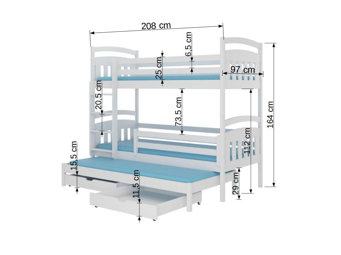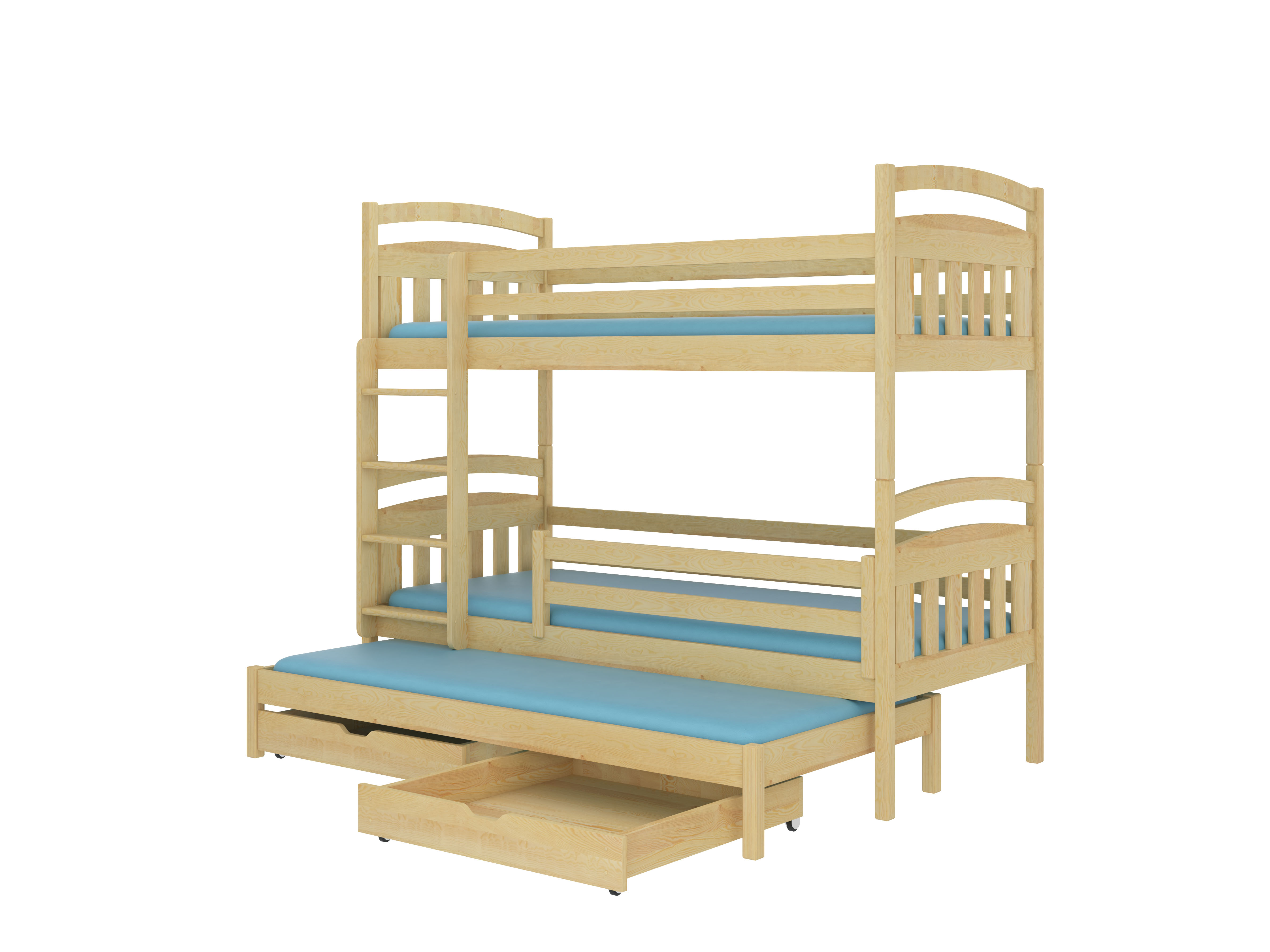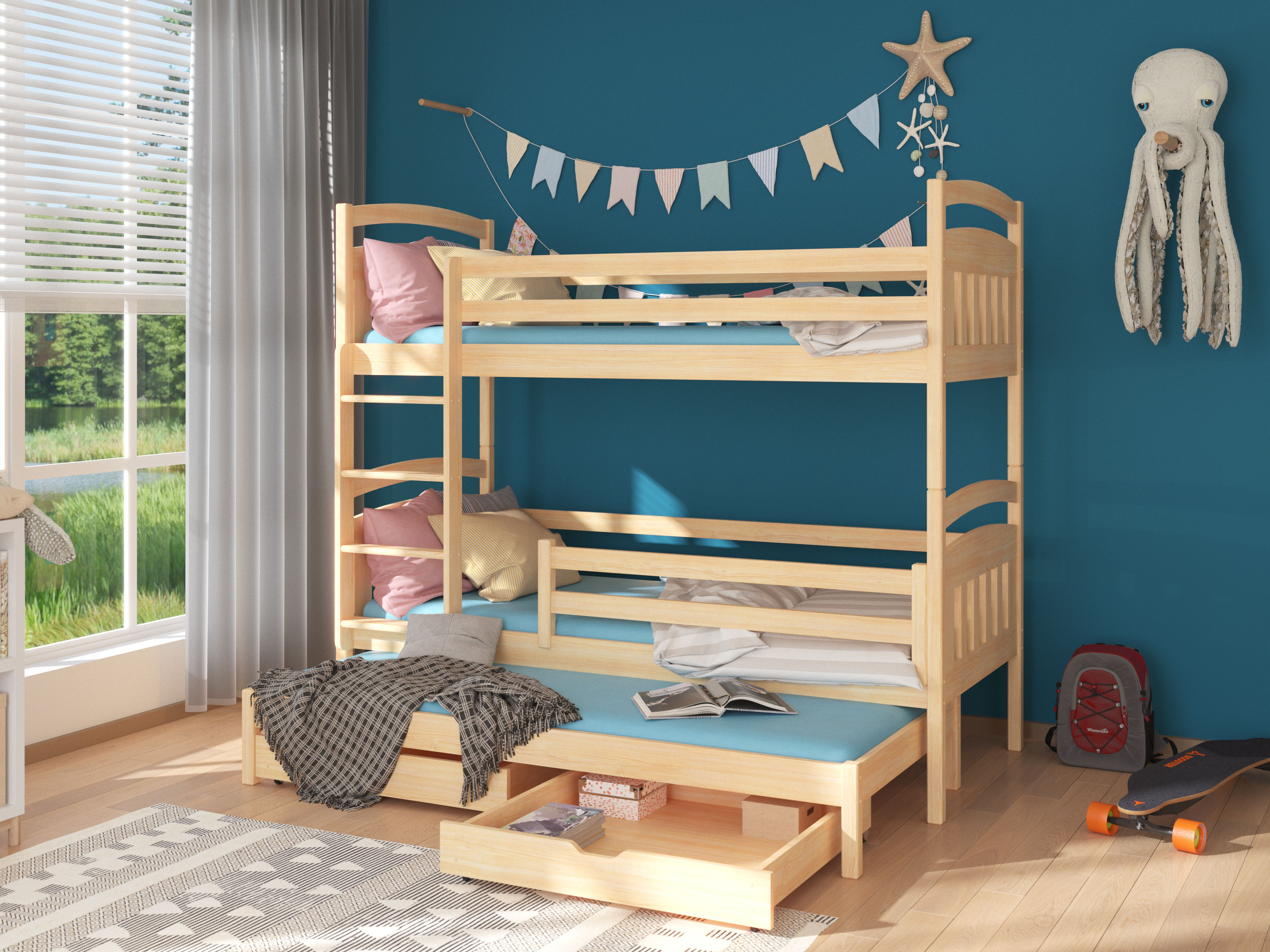 Poschodová detská posteľ ALADÁR s roštom a matracom je ideálnym riešením pre detské izby. Vyrobená z kvalitnej borovice, posteľ sa vyznačuje hrúbkou nôh 40x40 mm a ostatných prvkov 20-22 mm, čo zaručuje jej pevnosť a odolnosť. Lamelový rošt s hrúbkou 2 cm poskytuje optimálnu oporu a pohodlie, ktoré dopĺňa penový matrac s odnímateľným poťahom na zips. Vie sa pochváliť aj praktickými vysúvacími zásuvkami na gumených kolieskach, ktoré umožňujú uschovať hračky, oblečenie a ďalšie veci. S veľkorysou plochou na spanie 90x200 cm a výsuvným spodným lôžkom ponúka postieľka ALADÁR dostatok miesta pre pohodlný spánok a pre hostí alebo súrodencov. Bariéra proti spadnutiu na hornom lôžku zabezpečuje bezpečnosť a pokojný spánok. ALADÁR tiež ponúka možnosť výberu strany rebríka, čo umožňuje prispôsobiť postieľku podľa preferencií a priestoru v izbe. Produkt je dodávaný s príslušenstvom na montáž a montážnym návodom. Výrobný proces sa realizuje s použitím ekologických vodových farieb, ktoré sú bezpečné pre deti a odolné voči mechanickému poškodeniu.