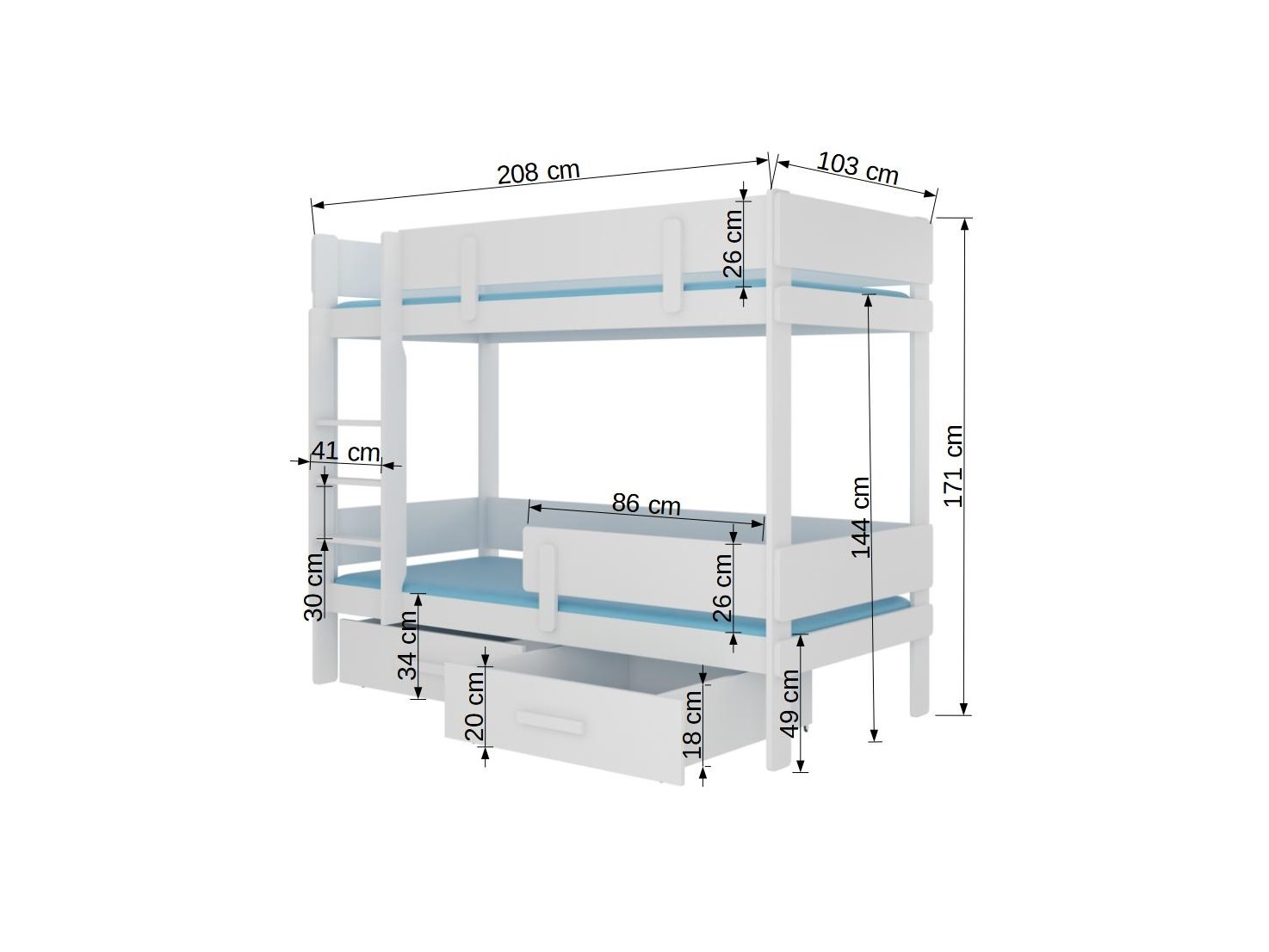 Poschodová detská posteľ Ellen je moderná a funkčná posteľ v bielo-sivej kombinácii s rozmermi 200x90 cm. Vyrobená je z borovicového dreva s laminovanou doskou hrúbky 18 mm a ABS hranami, čo zaručuje jej odolnosť a dlhú životnosť. Súčasťou postele je borovicový rošt s hrúbkou 2 cm, ktorý zabezpečuje spoľahlivú podporu a pohodlie počas spánku. Posteľ disponuje aj praktickým úložným priestorom v podobe 2x vysúvacej zásuvky na valčekoch, kde je možné uložiť hračky alebo oblečenie. Posteľ je vybavená bariérou proti spadnutiu, čo zabezpečuje bezpečnosť a ochranu počas spánku. Baleniu prislúcha príslušenstvo na montáž a montážny návod. Posteľ je lakovaná striekaním, pričom tri vrstvy laku ju robia odolnou voči mechanickému poškodeniu a nečistotám. Posteľ Ellen je ideálna voľba pre deti, ktoré sa budú cítiť pohodlne a bezpečne vďaka optimálnej podpore a pohodliu počas spánku.