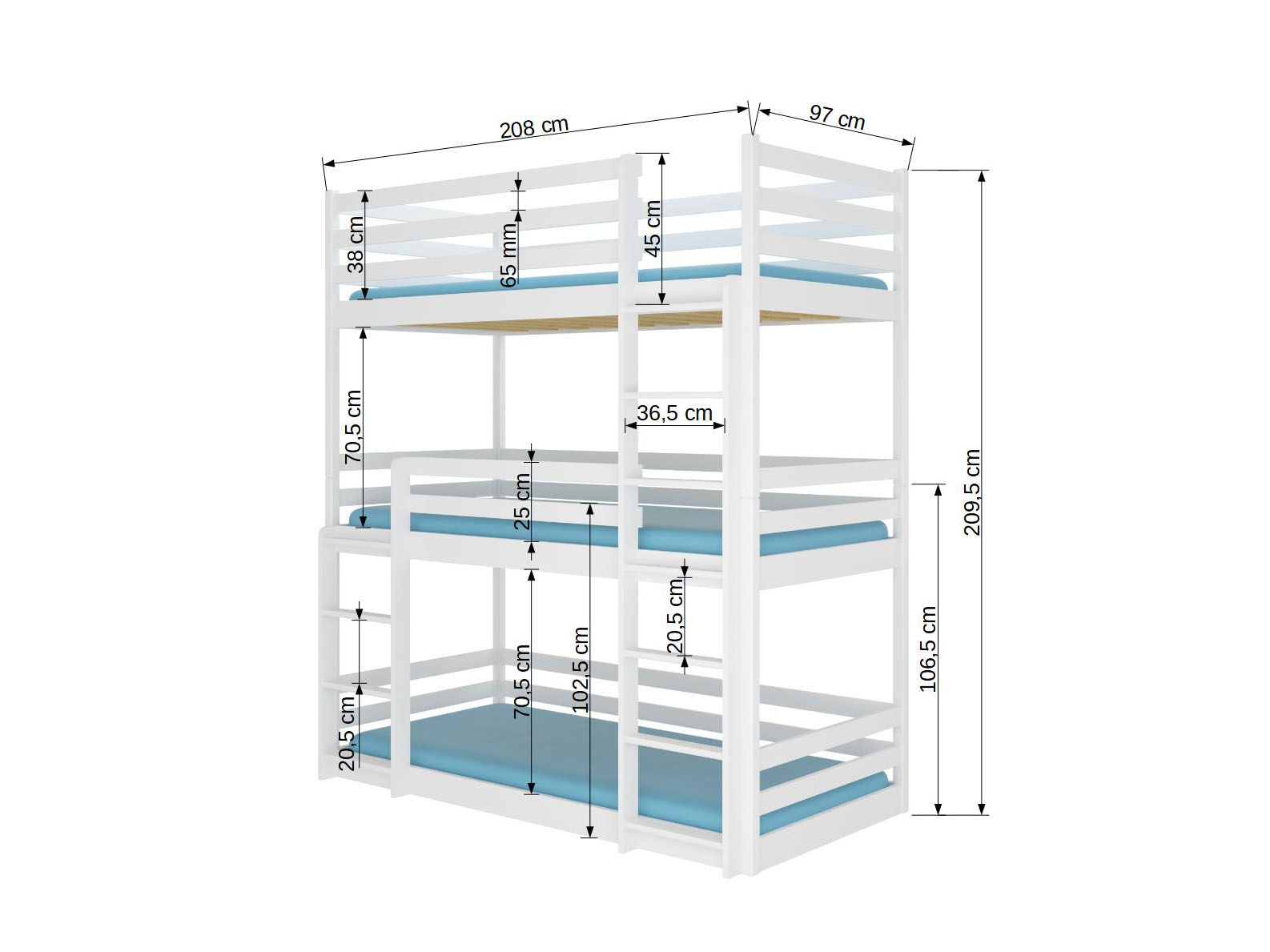 Poschodová detská posteľ 200x90 cm Teodor (s roštom a matracom) (borovica) je ideálna pre rodiny s viacerými deťmi alebo pre hostí, ktorí navštevujú váš domov. Posteľ je vyrobená z kvalitného borovicového dreva, s hrúbkou nôh 40x40 mm a ostatných prvkov 20-22 mm, čo zaručuje jej pevnosť a odolnosť. TEODOR je vybavená lamelovým roštom s hrúbkou 2 cm a penovým matracom s odnímateľným poťahom na zips, čo poskytuje optimálne pohodlie pre vášho malého dobrodruha. Posteľ ponúka tri úrovne spania a bariéru proti spadnutiu, čo zaručuje bezpečnosť pre vaše dieťa. Rebrík je tiež umiestnený na voľbu strany, čo umožňuje prispôsobiť postieľku podľa priestoru a preferencií vášho dieťaťa. Posteľ je nielen miestom na spanie, ale aj miestom na dobrodružstvo a hranie, a jej trojposchodový dizajn umožňuje vašim deťom vytvoriť si vlastný priestor na relaxáciu a odpočinok. Táto posteľ je skvelou voľbou pre každú detskú izbu, s ekologickými vodovými farbami použitými v celom výrobnom procese, ktoré sú bezpečné pre deti a odolné voči mechanickému poškodeniu. Posteľ je balená v 5 balíkoch, ktoré sú v celkovej hmotnosti 118 kg, a obsahuje príslušenstvo na montáž a montážny návod. Vitajte v detskom raji!