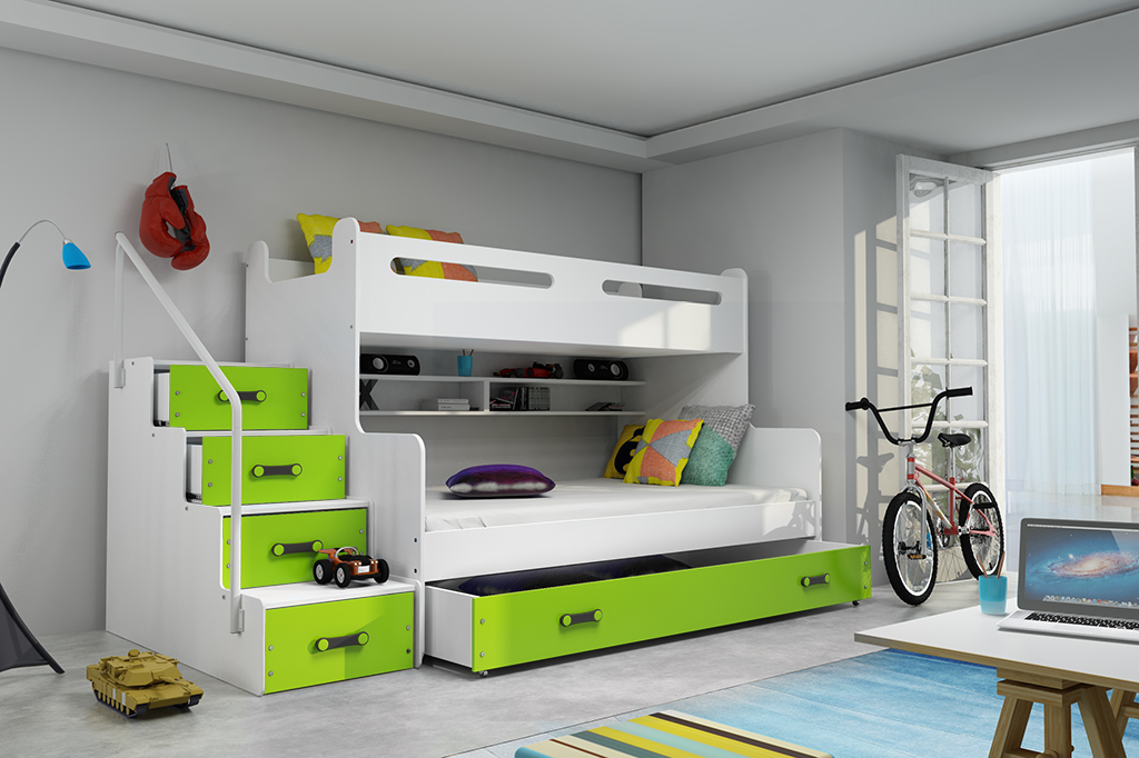 Poschodová posteľ 120 x 200 cm Moxxo 3 (biela + zelená) (s roštami, matracmi a úl. priestorom)