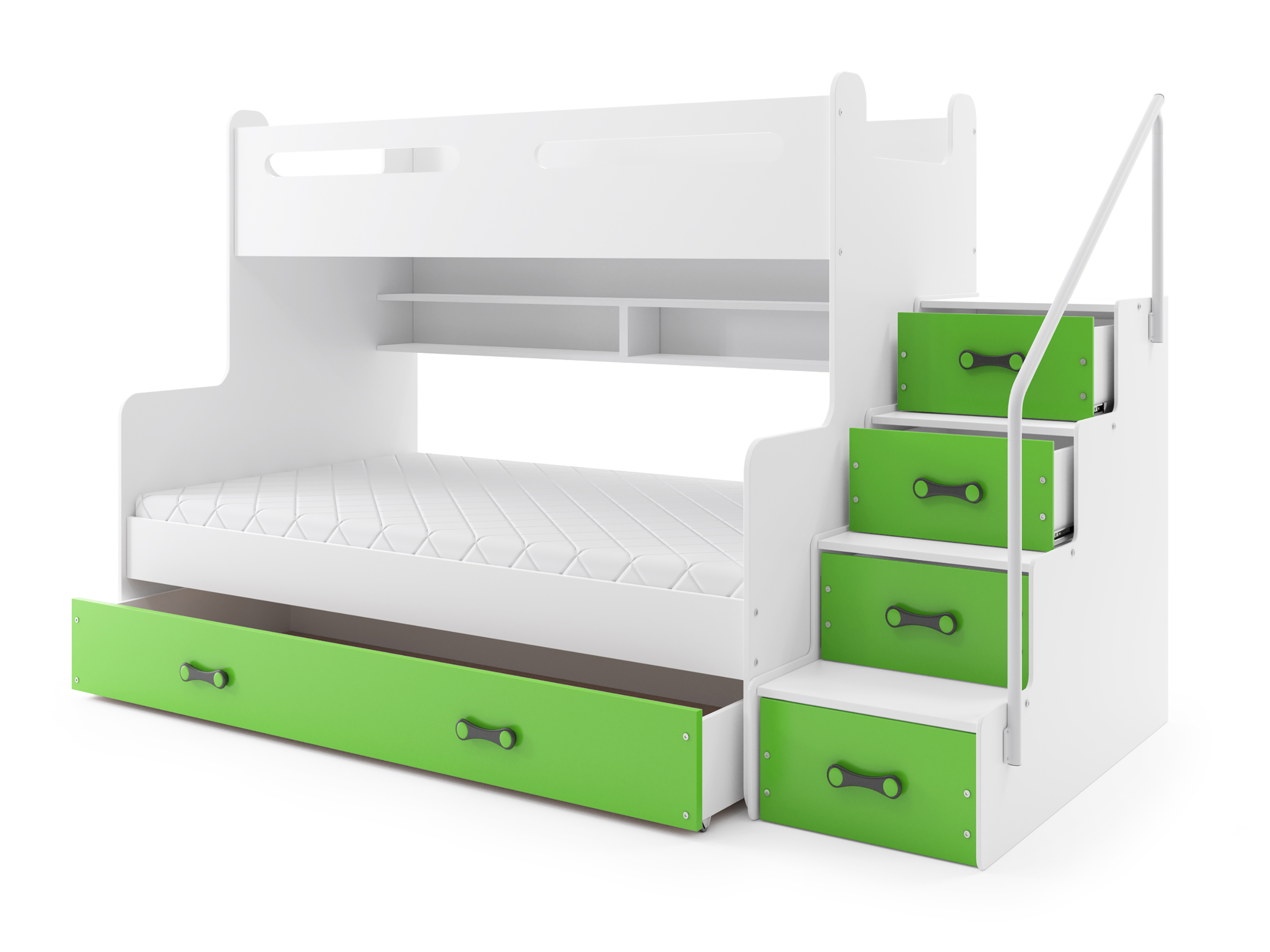 Poschodová posteľ Moxxo 3 od BMS Group v bielo-zelenej farbe s rozmermi 120 x 200 cm a výškou 145 cm je skvelým riešením pre vaše deti. Vďaka širokému úložnému priestoru pod posteľou a priloženým roštom a matracom, je táto posteľ plne vybavená a pripravená na okamžité použitie. Rám postele je vyrobený z MDF a lakovaný na vodnej báze, čo dodáva posteli odolnosť a eleganciu. Boky postele sú tiež vyrobené z MDF a lakovanej na vodnej báze, čo zaručuje vysokú kvalitu a bezpečnosť súladu s normami TUV. Celkové rozmery postele sú 262 cm (š) x 124 cm (hĺbka), čo znamená, že táto posteľ je ideálna pre menšie izby a jej moderný dizajn sa hodí do každého interiéru.