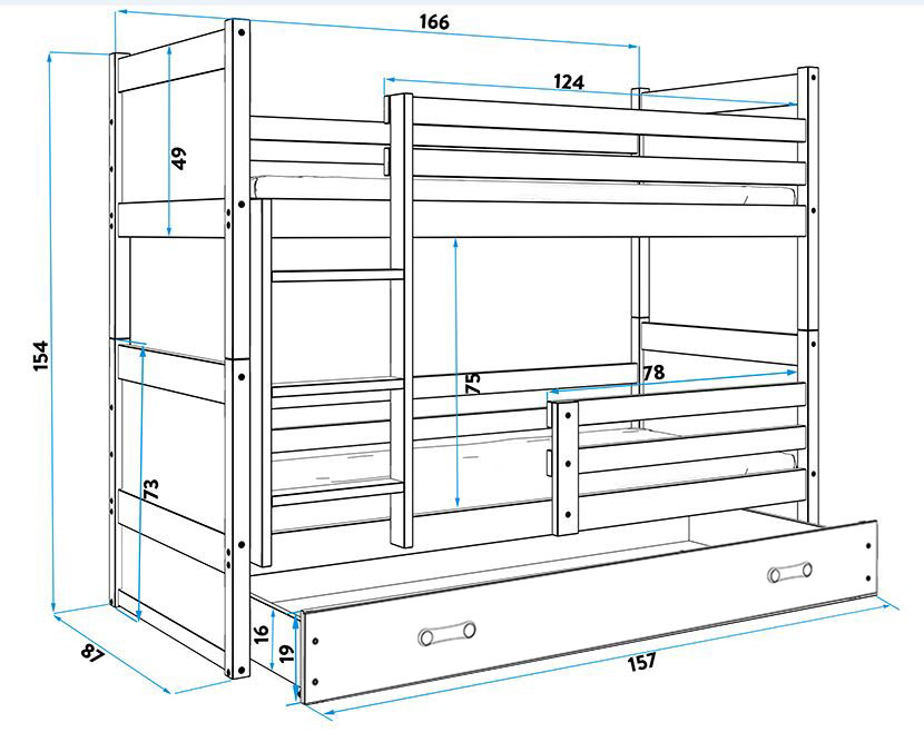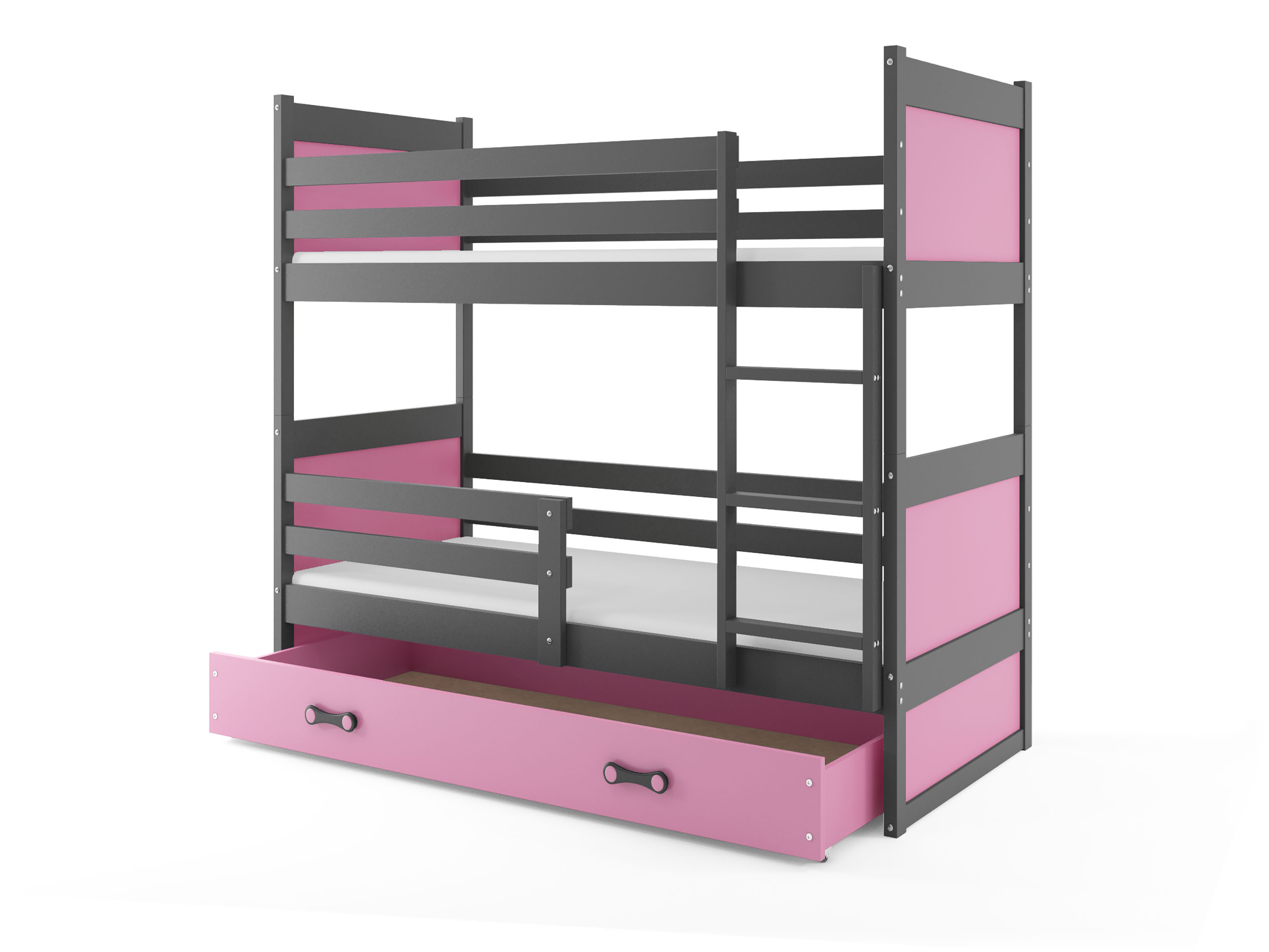 Poschodová posteľ 80 x 160 cm od BMS Group - Ronnie B (grafit + ružová) je pre deti to pravé. S výškou 154 cm a šírkou 166 cm, je ideálna pre menšie izby. S posteľou prichádzajú rošty, matrace a úložný priestor, takže si môžete byť istí, že vaše dieťa bude mať všetko, čo potrebuje na prijemný spánok a ukladanie vecí. Rám postele je vyrobený z borovicového dreva, ktoré je pokryté lakom na vodnej báze, čo zabezpečuje odolnosť a estetický vzhľad. Dostupná je v modernom dizajne grafitem a ružovou farbou, ktorá sa hodí pre dievčenskú izbu. S touto posteľou získate praktický a zároveň pekný prvok do izby vášho dieťaťa.