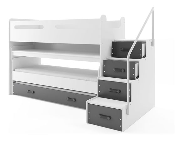 Poschodová posteľ Moxxo 1 od BMS Group v bielo-grafitovej farbe so šírkou 262 cm, výškou 124 cm a hĺbkou 124 cm je ideálna volba pre deti alebo hosťovskú izbu. Zahrňuje rošty, matrace a úložný priestor. Rám postele je vyrobený z MDF s lakom na vodnej báze pre optimálnu trvanlivosť. Boky postele sú tiež z MDF s lakom na vodnej báze. Táto posteľ bola vyrobená s ohľadom na kvalitu a bezpečnosť v súlade s normami TUV. S touto postelou sa nemusíte obávať o zdravie vašich detí a hostí.