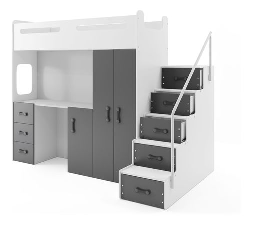 Poschodová posteľ 80 x 200 cm - BMS Group - Moxxo 4 (biela + grafit) (s roštami, matracmi a úl. priestorom) s výškou 180 cm, šírkou 260 cm a hĺbkou 151,5 cm je ideálna pre detskú izbu s nedostatkom priestoru. Rám postele je vyrobený z MDF a lakovaný na vodnej báze, zatiaľ čo boky postele sú z MDF lakovanej na vodnej báze. Bezpečnosť a kvalita sú zaručené vďaka dodržiavaniu noriem TUV. Okrem toho, posteľ je vybavená roštami a matracmi a má úložný priestor pod spodnou posteľou, čo ju robí praktickou a funkčnou pre rodiny s deťmi. Kombinácia biela + grafit dodáva posteli moderný a elegantný vzhľad, ktorý sa hodí do každej izby.