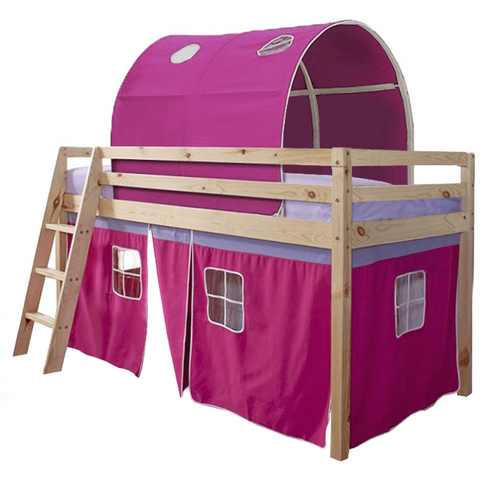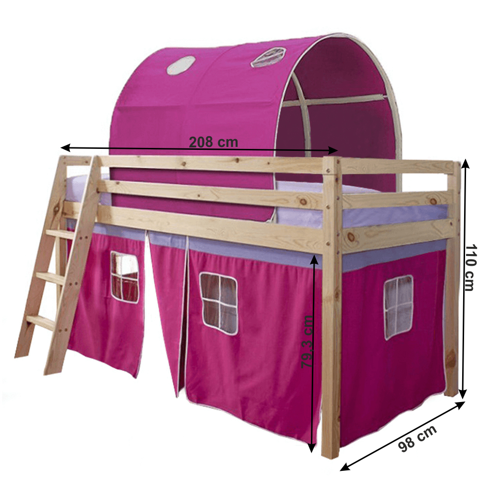 Detská posteľ so zvýšeným lôžkom. Spodná časť zo závesom sa dá využiť na hranie alebo na odkladanie hračiek. Rebrík sa dá upevniť na ľavej alebo pravej strane. Posteľ je dodávaná s latovým roštom.