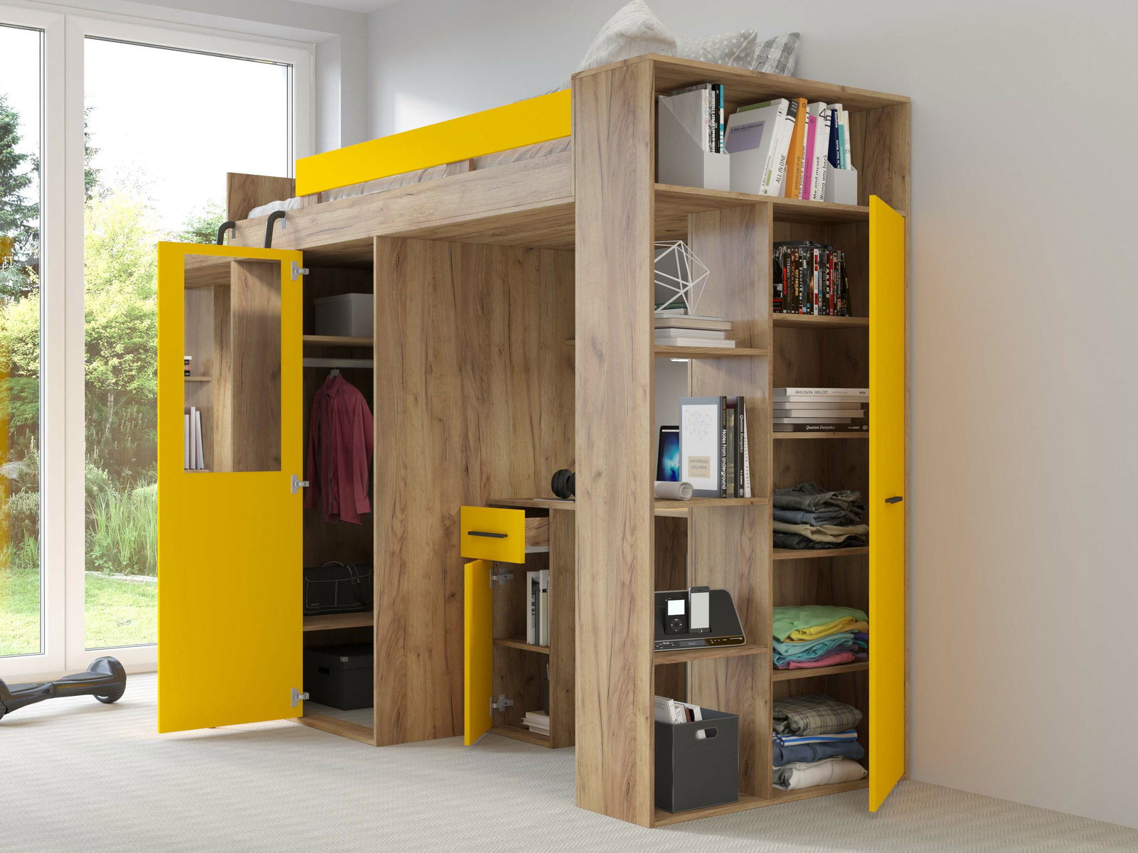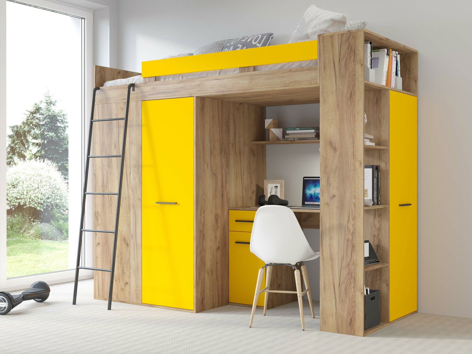 Poschodová posteľ 90 cm Vivian (L) (s roštom) (dub craft zlatý + žltá) je dokonalou voľbou pre zariadenie detskej izby. Táto multifunkčná posteľ ušetrí veľa miesta a určite sa bude páčiť vašim deťom. Posteľ Vivian obsahuje PC stolík so skrinkou a zásuvkou, poličky na knihy, policovú a šatníkovú skriňu a rošt. Je dostupná v niekoľkých farebných prevedeniach a dodáva sa bez matraca. Posteľ je vyrobená z laminovanej drevotriesky (16 mm) s ABS hranami a vybavená tichým dovieraním. Vhodná výška matraca je 12 cm a rozmery posteľnej plochy sú 90x200 cm. Balík obsahuje 7 častí a po odstránení ochrannej fólie sa neodporúča čistiť povrch po dobu 24 hodín. Odporúča sa čistenie mierne vlhkou handričkou bez použitia chemických prípravkov.