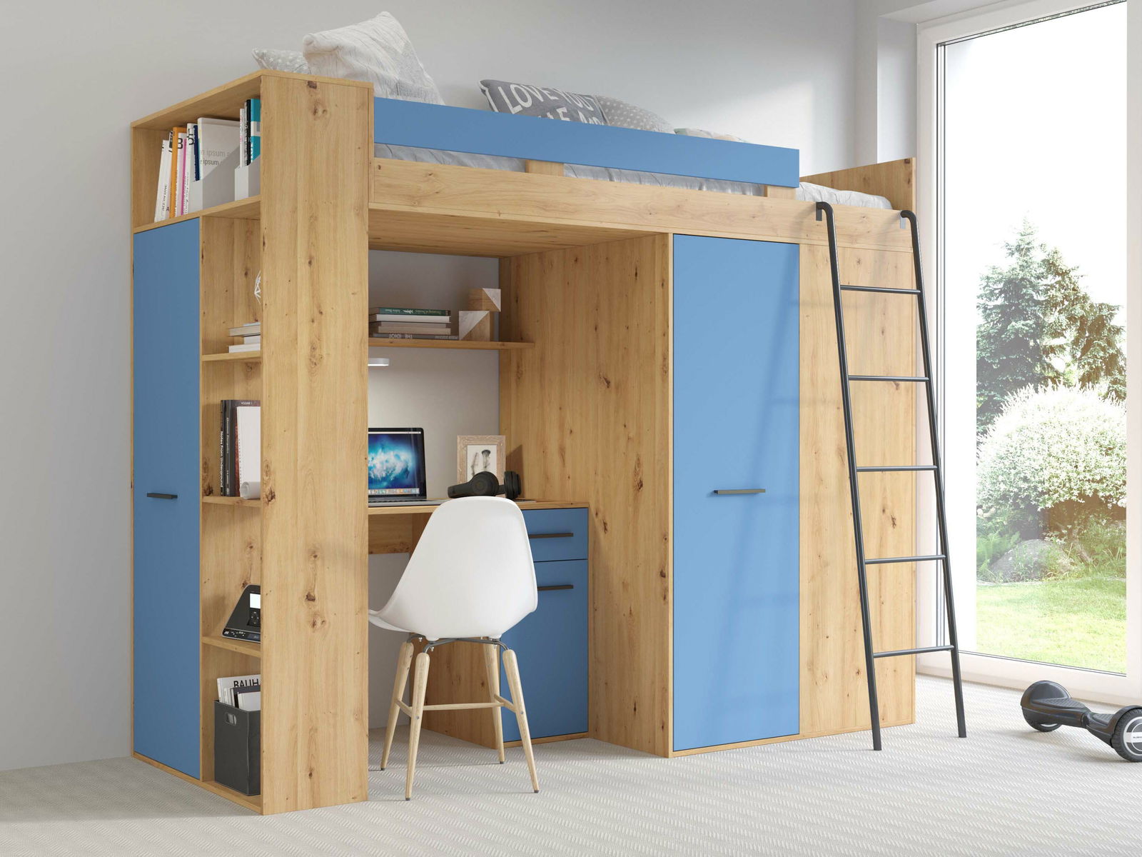 Poschodová posteľ 90 cm Vivian (P) (s roštom) (dub artisan + nebeská modrá) je ideálnym multifunkčným nábytkom pre detskú izbu, ktorý ušetrí veľa miesta. Tento výrobok obsahuje PC stolík so skrinkou a zásuvkou, poličky na odkladanie kníh, policovú skriňu, šatníkovú skriňu a rošt. Má laminovanú drevotriesku (16 mm) a ABS hrany. Posteľ je vhodná pre matrac s výškou 12 cm a ponúka plochu spania 90x200 cm. Dodáva sa bez matraca a je dostupná v rôznych farebných prevedeniach. Balík obsahuje 7 častí s rôznymi rozmermi. Tento výrobok má pravú verziu. Po odstránení ochrannej fólie sa odporúča počkať 24 hodín pred čistením mierne vlhkou handričkou bez použitia chemických prípravkov.