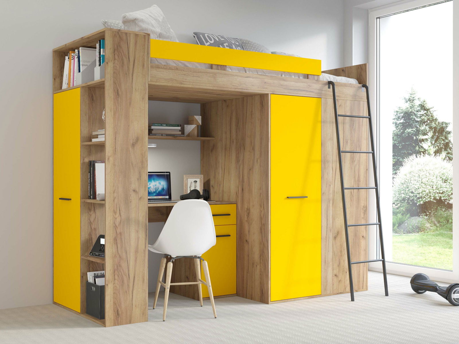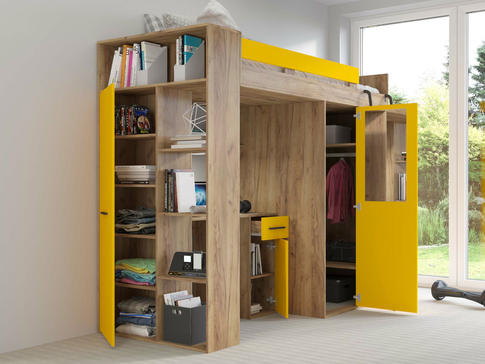 Poschodová posteľ 90 cm Vivian (P) (s roštom) (dub craft zlatý + žltá) je multifunkčný nábytok, ktorý je vhodný do detskej izby. Patrí medzi šetrné riešenia pre úsporu miesta v izbe. Posteľ Vivian zahŕňa PC stolík so skrinkou a zásuvkou, poličky na odkladanie kníh, policovú skriňu, šatníkovú skriňu a rošt. Posteľ je dostupná v niekoľkých farebných prevedeniach a bez matraca. Je vyrobená z laminovanej drevotriesky (16 mm) s ABS hranami. Maximálna výška matraca, ktorý sa do postele hodí, je 12 cm. Posteľ má plochu spania 90x200 cm a rozmery balíkov sú uvedené podľa čísel 1 až 7. Posteľ je dostupná v ľavej aj pravej verzii. Treba si dať pozor na vysokokvalitný náter, ktorý je čerstvý a mohol by sa poškriabať, ak sa naňho príliš rýchlo prisadnete po odstránení ochrannej fólie. Odporúča sa čistenie mierne vlhkou handričkou bez použitia chemických prípravkov.