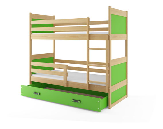 Poschodová posteľ 90 x 200 cm Ronnie B (borovica + zelená) (s roštami, matracmi a úl. priestorom)