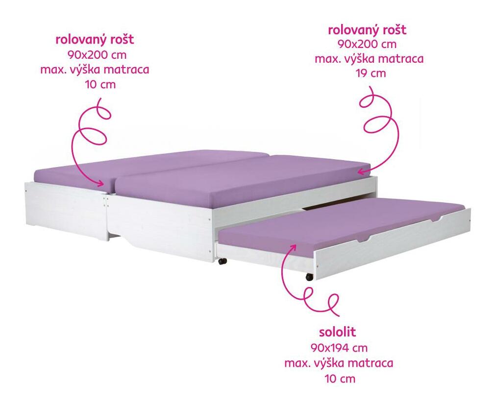 S dvoma prístelkami, výsuvná prístelka, dodávaná s latkovým roštom, prístelka na kolieskach, dodávané bez matracov