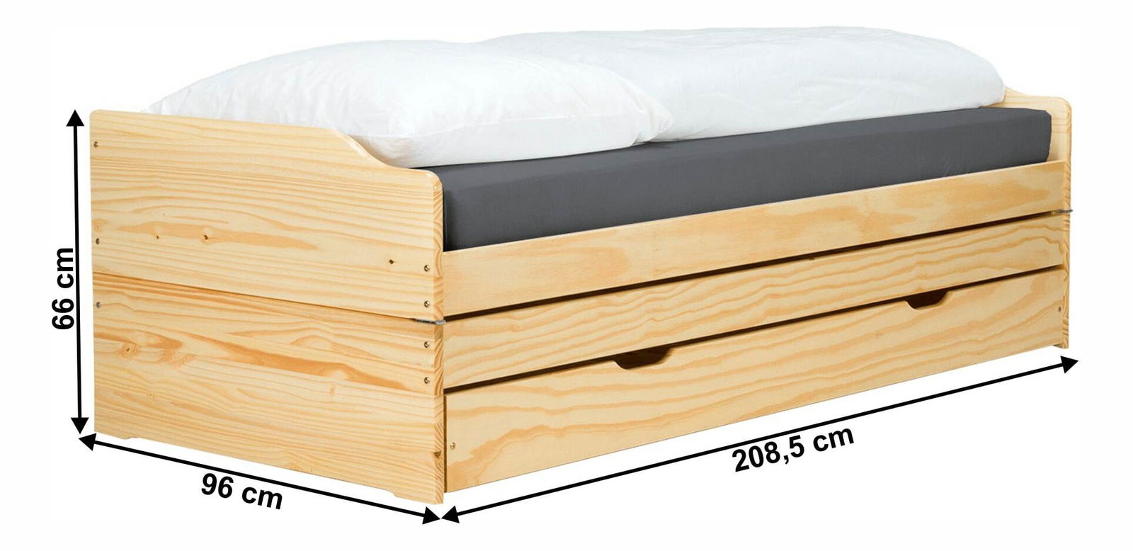 Posteľ s výsuvnými prístelkami Flapi (borovica) s výškou 66 cm, dĺžkou 208,5 cm a šírkou 96 cm je vyrobená z lakovaného masívneho borovicového dreva, ktorý zaisťuje jej dlhú životnosť. Táto posteľ je oblečená v prírodnej farbe, ktorá zdôrazňuje viditeľnú kresbu dreva. Obsahuje dve prístelky, z toho jedna je vysúvateľná na kolieskach. Ideálna pre menšie detské alebo študentské izby. Posteľ Flapi svojim dizajnom vnesie do miestnosti vôňu prírody. V spodnej časti postele sa nachádza medzera, ktorá umožňuje ľahkú manipuláciu s posteľou a umožňuje premeniť ju na praktické lôžko s rozmerom 90x194 cm. Posteľ je dodávaná s látkovým roštom, ale bez matraca. Pre optimálny komfortné spanie svojich ratolestí odporúčame zakúpenie matraca z našej ponuky. Doprajte svojim deťom pohodlný a zdravý spánok s posteľou Flapi.