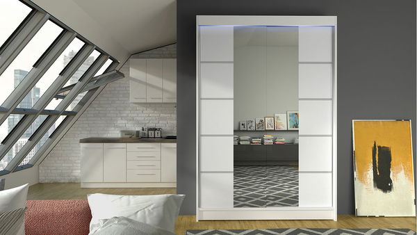 Posuvná skriňa Parys V je ideálnou voľbou pre tých, ktorí hľadajú pohodlie a štýl. Receptom dobre usporiadaného úložného priestoru v obývacej izbe, spálni a šatni je posuvná skriňa Parys V . Optimálne usporiadanie otvorených políc a tyče pre vešiaky poskytuje veľa priestoru na oblečenie, obuv, kufre a dokonca aj športové potreby. Menej používané doplnky môžete umiestniť na najvyššie police, čím ušetríte ľahko prístupné oblasti šatníka. Z vizuálneho hľadiska je šatník k dispozícii v niekoľkých módnych farbách, pričom každá verzia je sprevádzaná zrkadlom namontovaným v strednej časti predných častí. Dekoratívnou hodnotou sú tiež symetrické pruhy zdobiace ľavú a pravú časť nábytku. Rozmery: šírka: 120 cm, výška: 200 cm, hĺbka: 58 cm Prevedenie: laminovaná doska s hrúbkou 16 mm, hrany zakončené ABS dýhou, systém posuvných dverí, hliníkové vodidlá Sevra typu Micra, zrkadlo na prednej strane, rukoväť vo forme hliníkového pásu, pozdĺž dverí hliníkové držadlá bránia dverám v ohybe vybavené tyčou a priestrannými policami, RGB LED osvetlenie ako doplnková možnosť za príplatok (15 variabilných farieb + diaľkové ovládanie) Záruka: 24 mesiacov