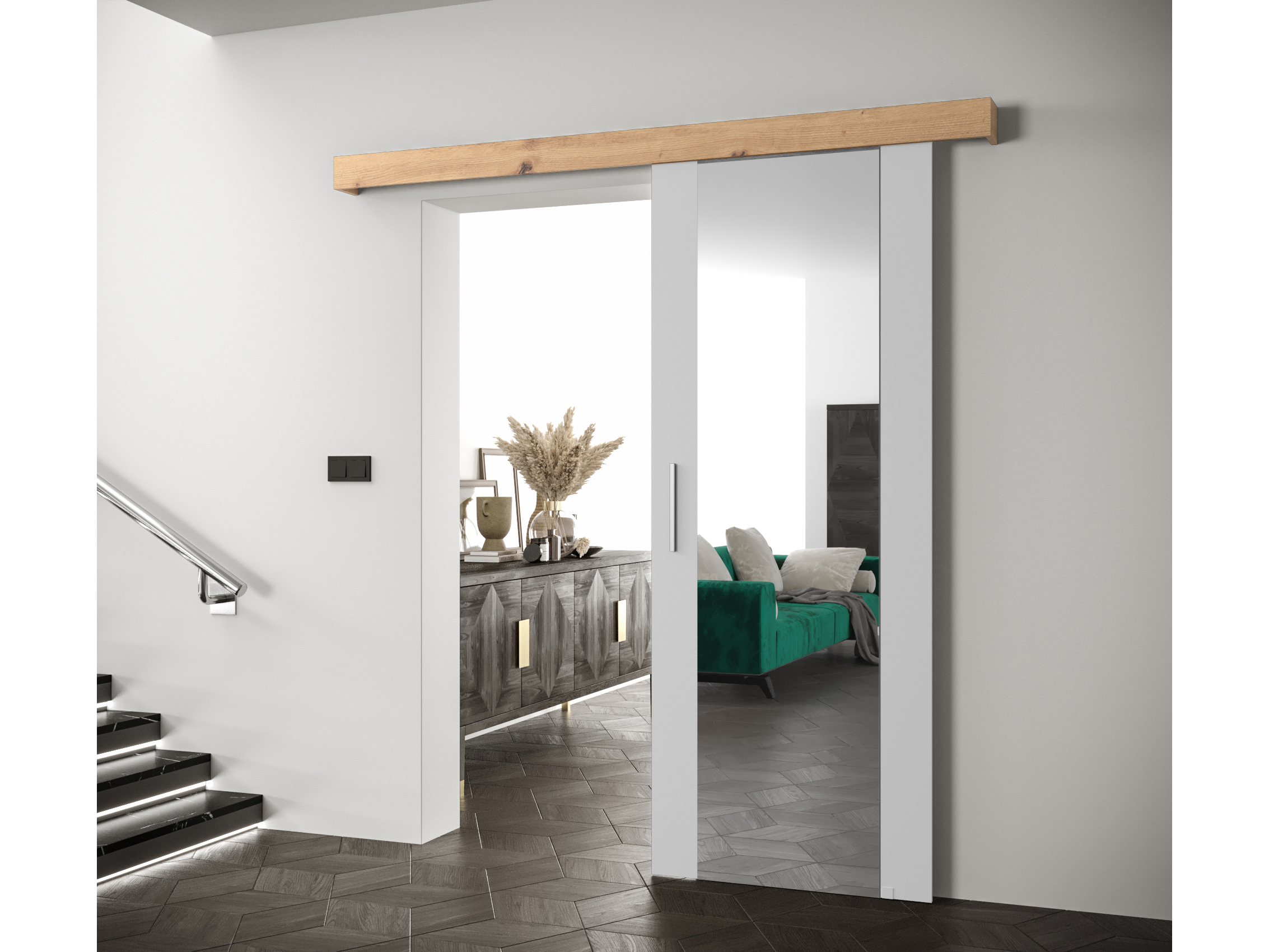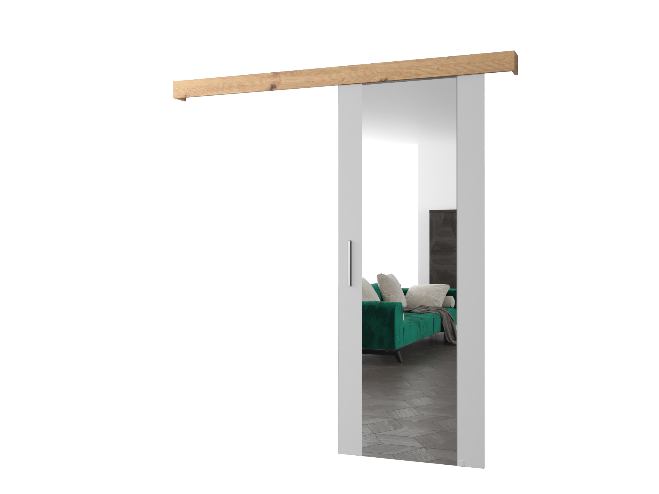 Posuvné dvere 90 cm Sharlene II (biela matná + dub artisan + strieborná) (so zrkadlom)