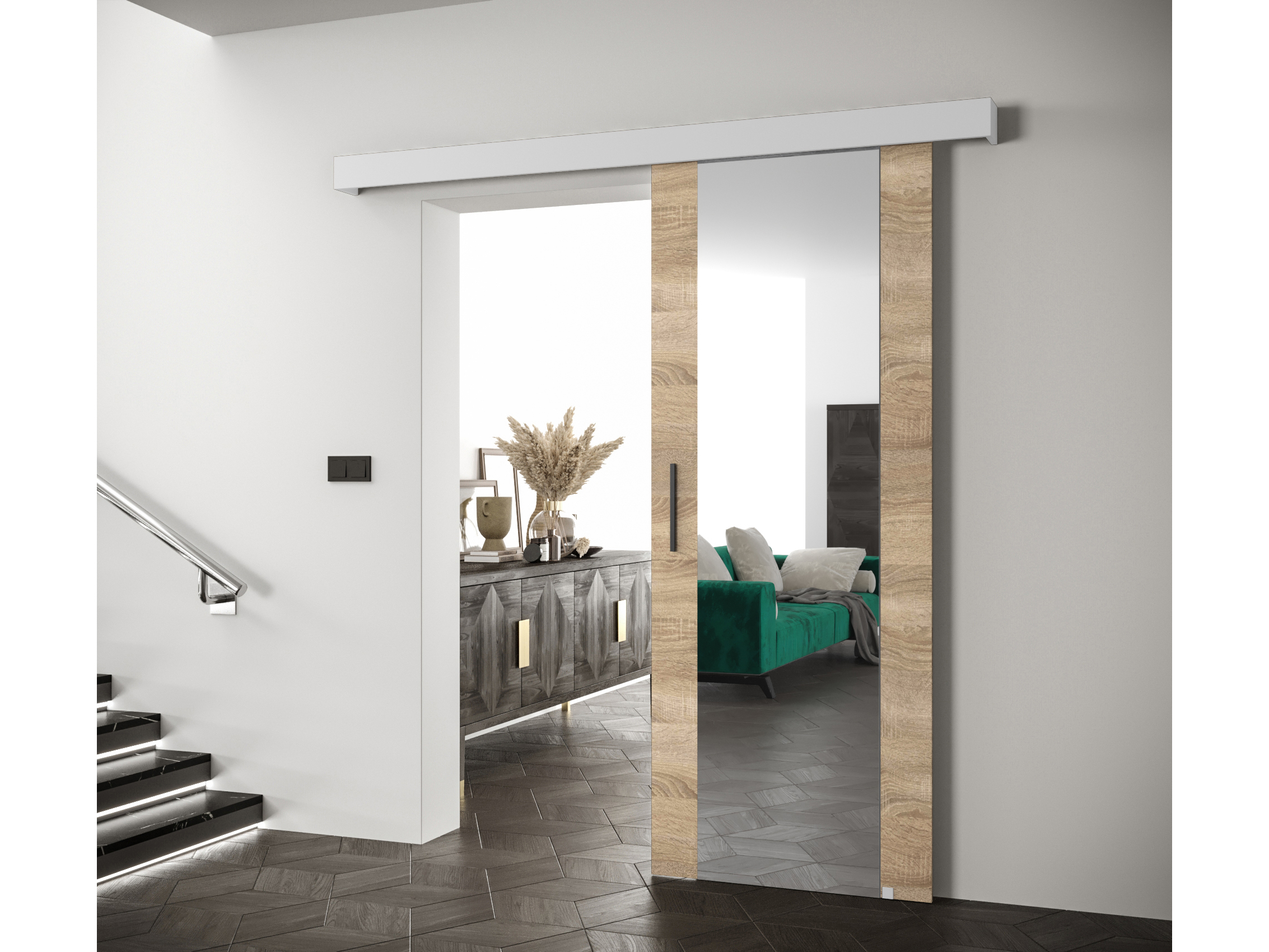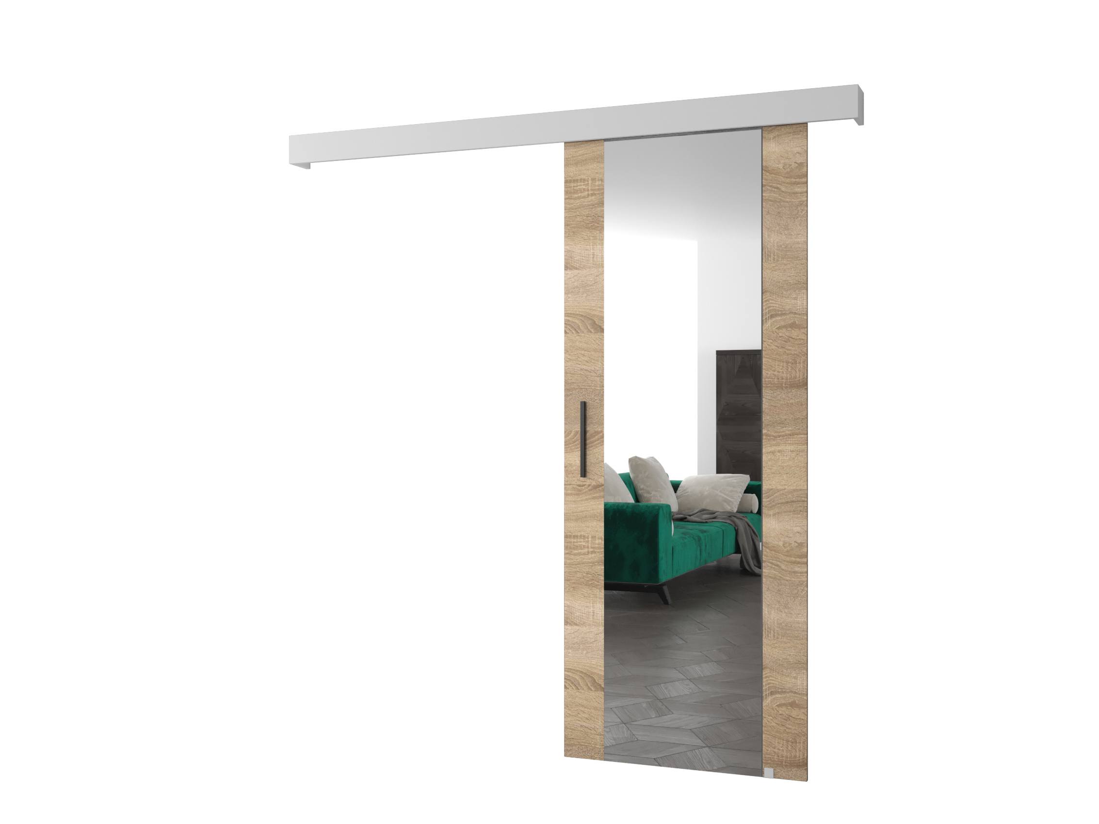 Posuvné dvere 90 cm Sharlene II (dub sonoma + biela matná + čierna) (so zrkadlom)